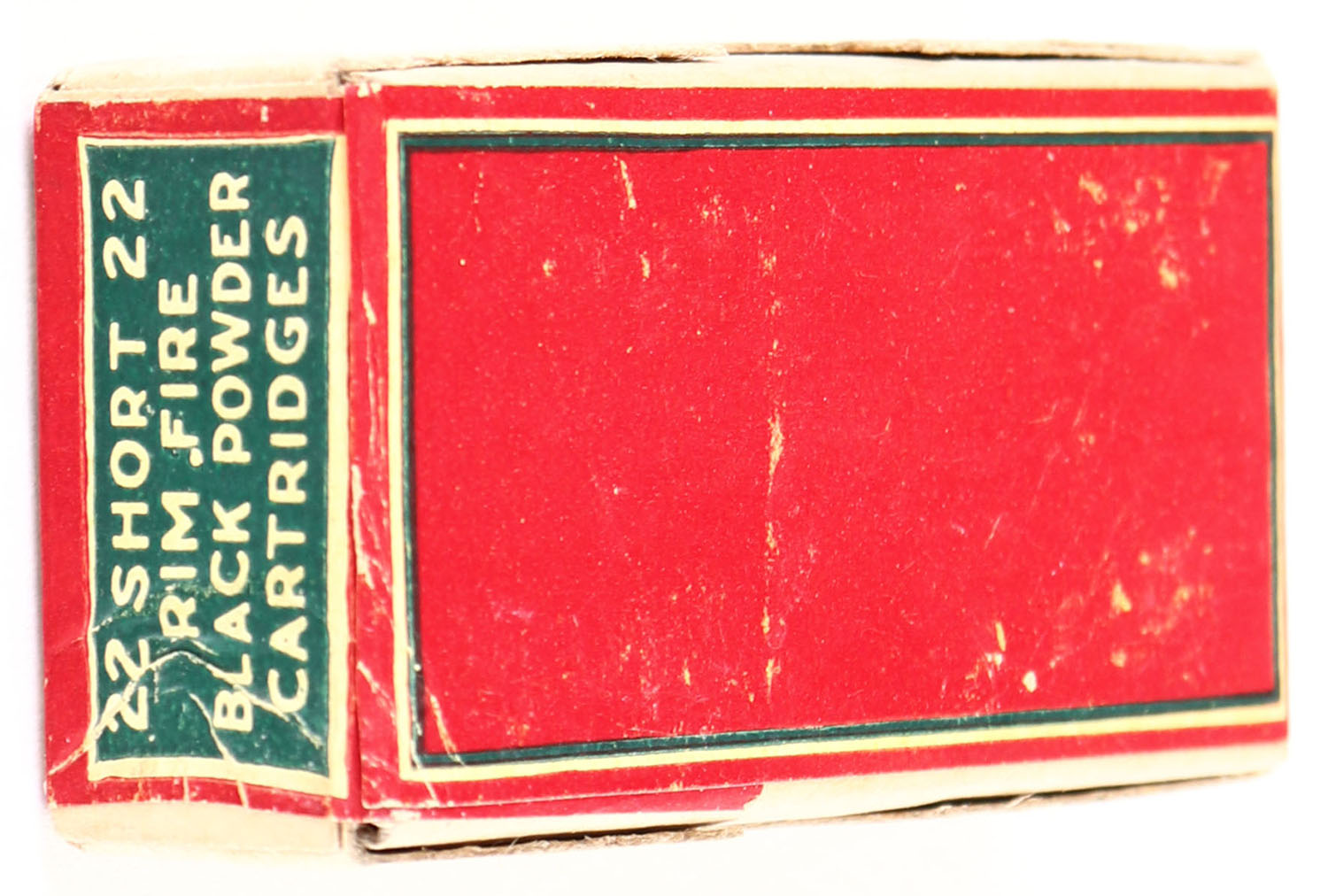 Meriden, Black Powder Cartridges, .22 Short, RHWeb: MER-1 S-5, FULL & SEALED, 2pc. Buff box with red & green wraparound label, box is solid with excellent color, very minor shelf wear, on top, minor shelf wear on bottom, corners are sharp, edges are crisp, label is intact. Grade: Excellent ++ - Value: 1500 to 3000