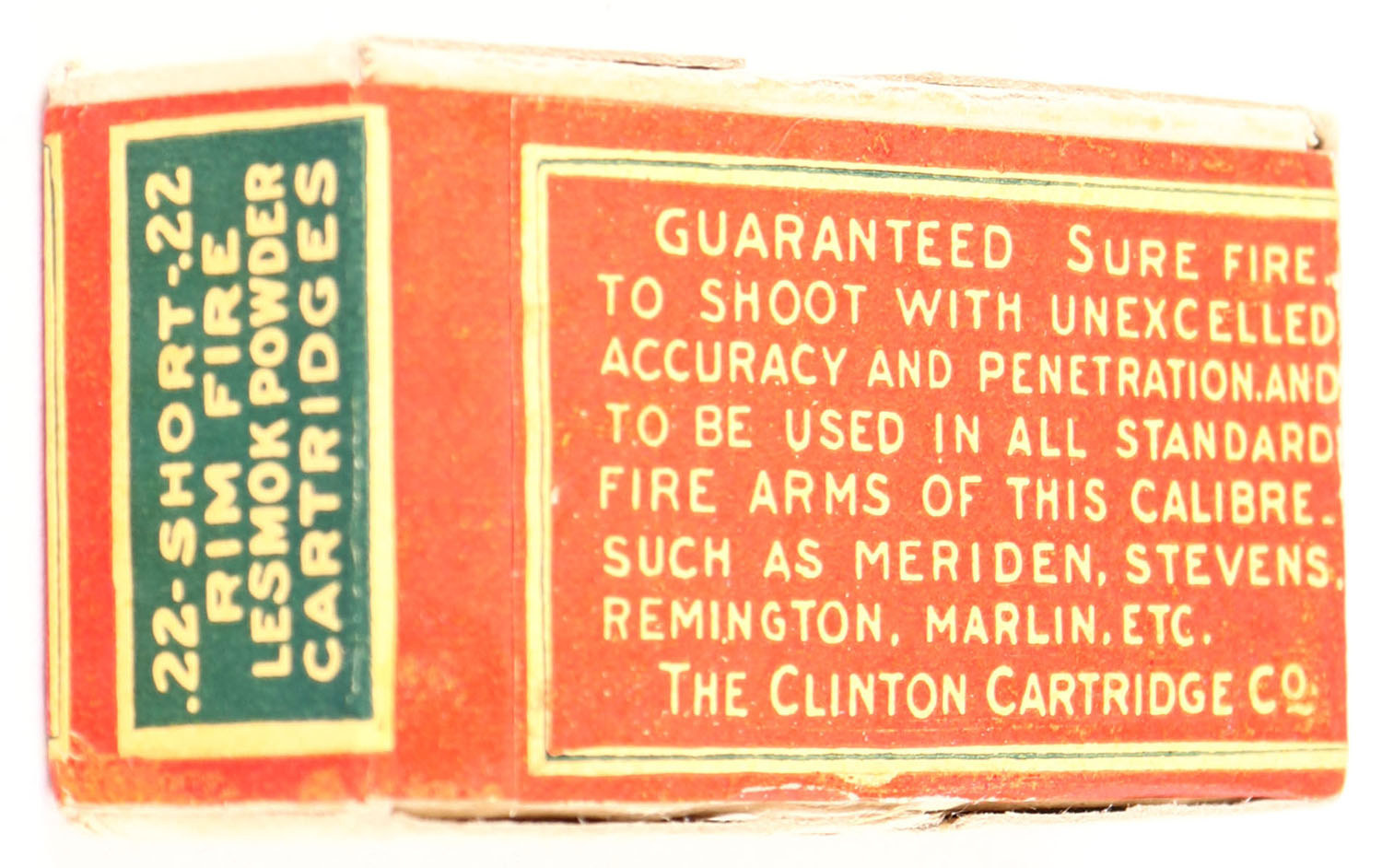 Clinton, Lesmok Powder Cartridges, .22 Short, RHWeb: CLINT-1 S-2.1a, FULL & SEALED, 2pc. Buff box with red & green wraparound label, box is solid with excellent color, very minor edge & corner wear, label is intact. Grade: Excellent + - Value: 60 to 240
