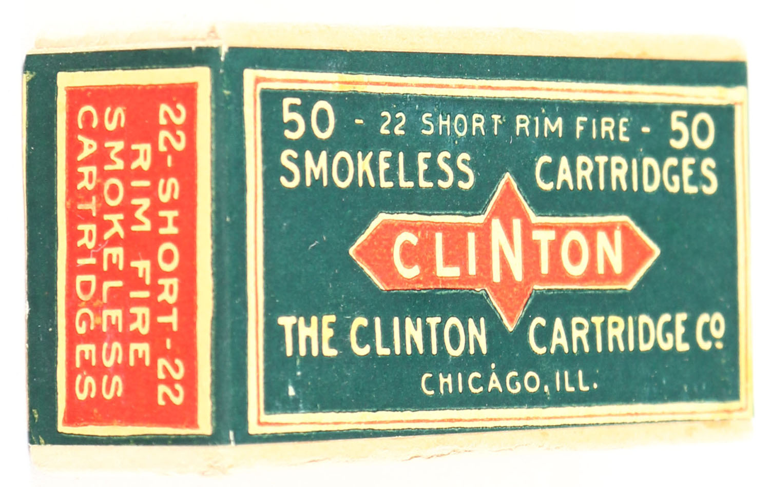 Clinton, Smokeless Cartridges, .22 Short, RHWeb: CLINT-1 S-3b, FULL & SEALED, 2pc. Buff box with green & red wraparound label, box is solid with minty color, very minor edge & corner wear, label is intact. Grade: Excellent ++ - Value: 60 to 240