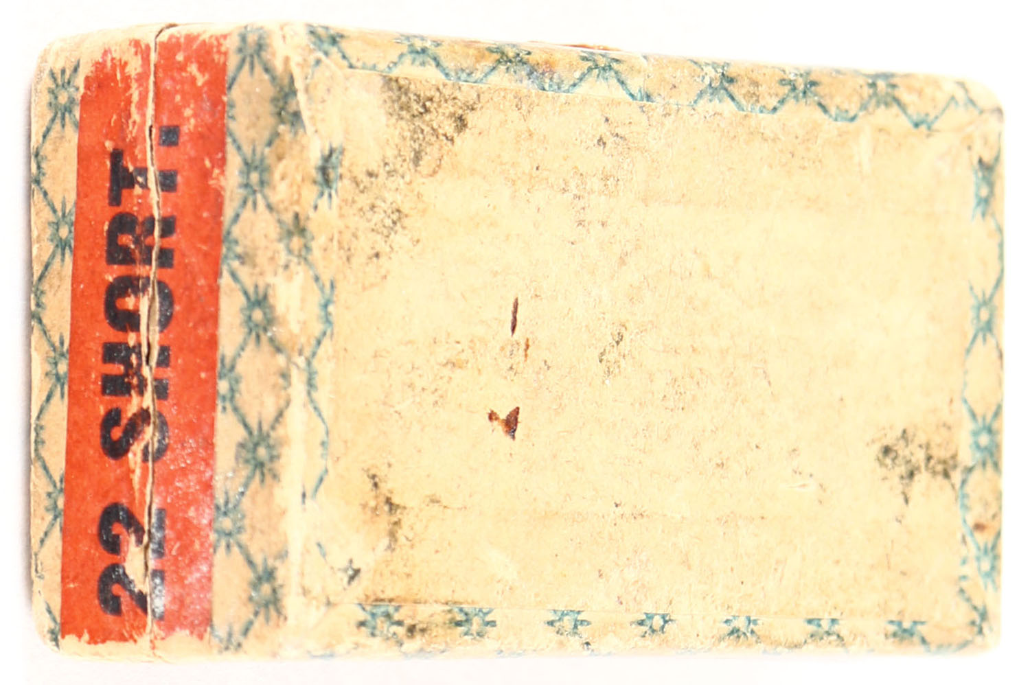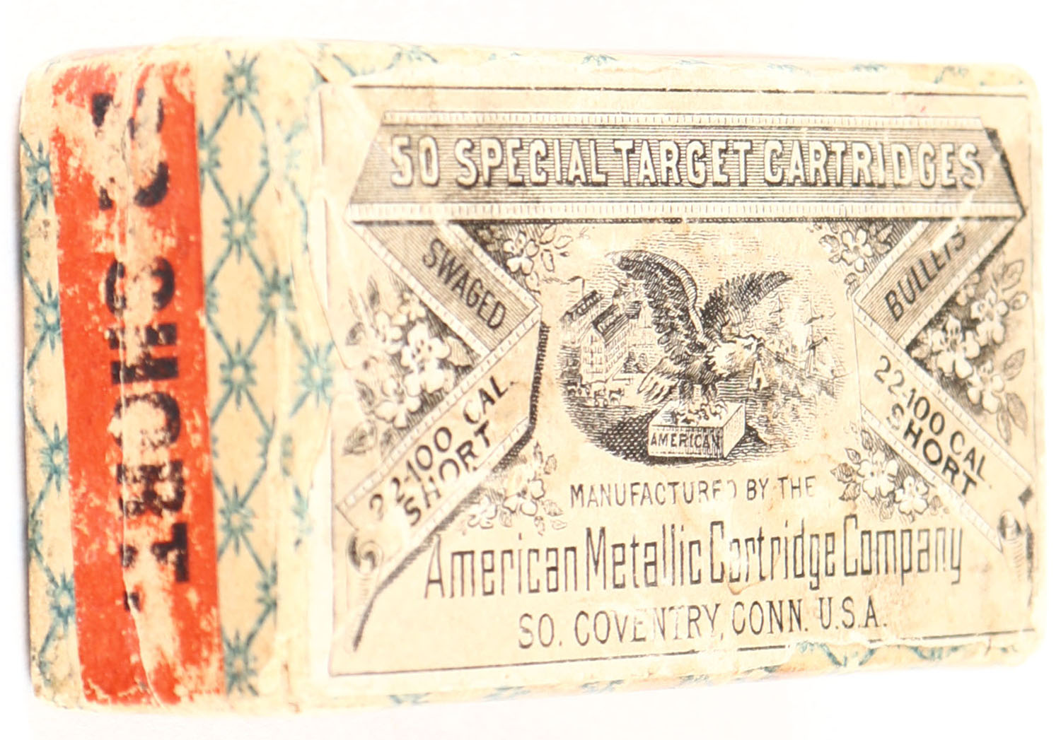American Metallic Cartridge Company, Special Target Cartridges, .22 Short, RHWeb: AMC-1 S-2b, Full, 2pc. Blue patterned box with cream colored top & red side sealing labels, box is solid with very good color, some age soiling, minor edge & corner wear, labels are intact, ammo is fair. Grade: Very Good + - Value: 200 to 800