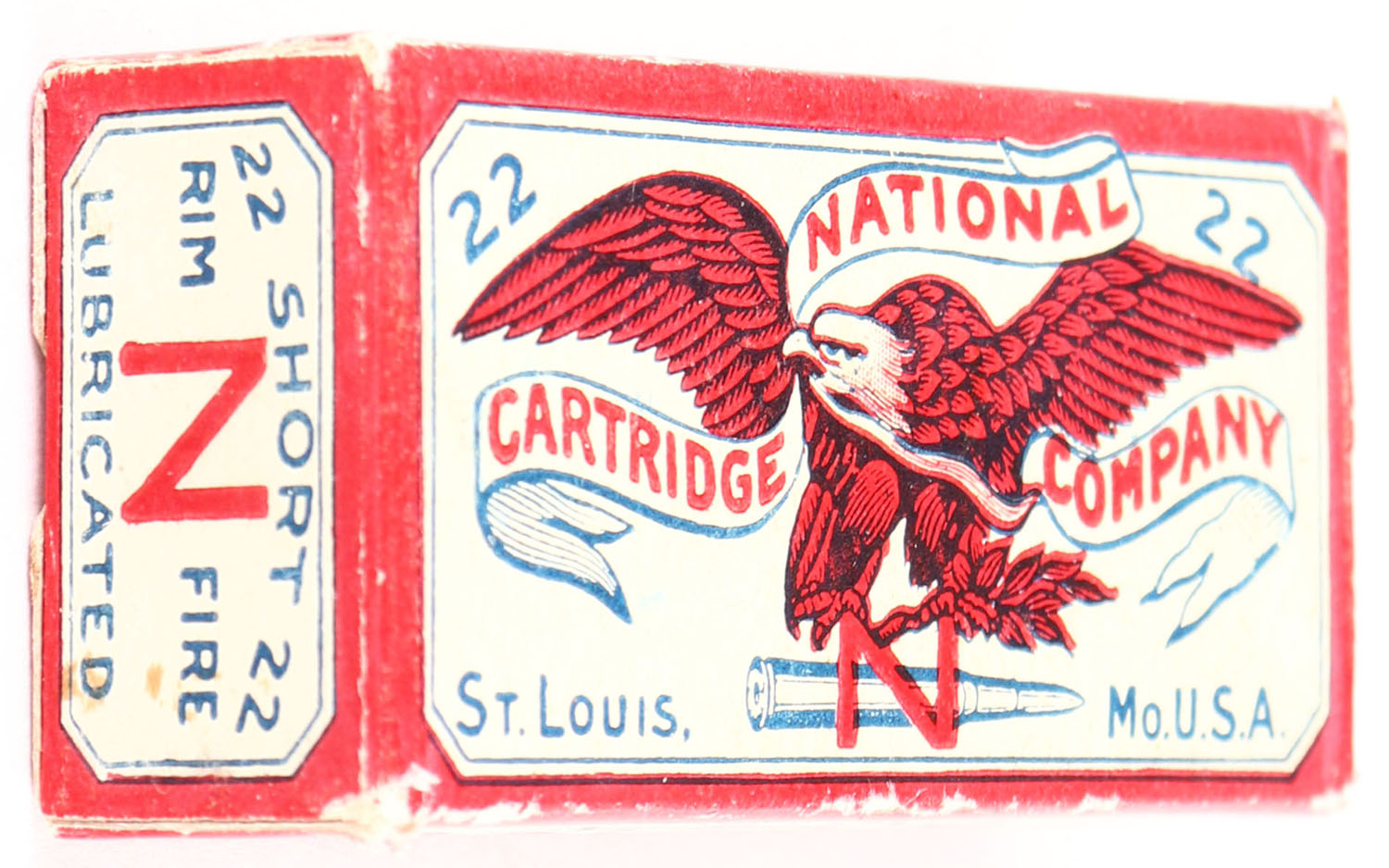 National Cartridge Company, Nublend Powder, .22 Short, Lubricated, RHWeb: NCC-1 S-3, Full, 1pc. White & red box, box is solid with excellent color, very minor edge & corner wear, end flaps are solid, ammo is good. Grade: Excellent - Value: 200 to 600