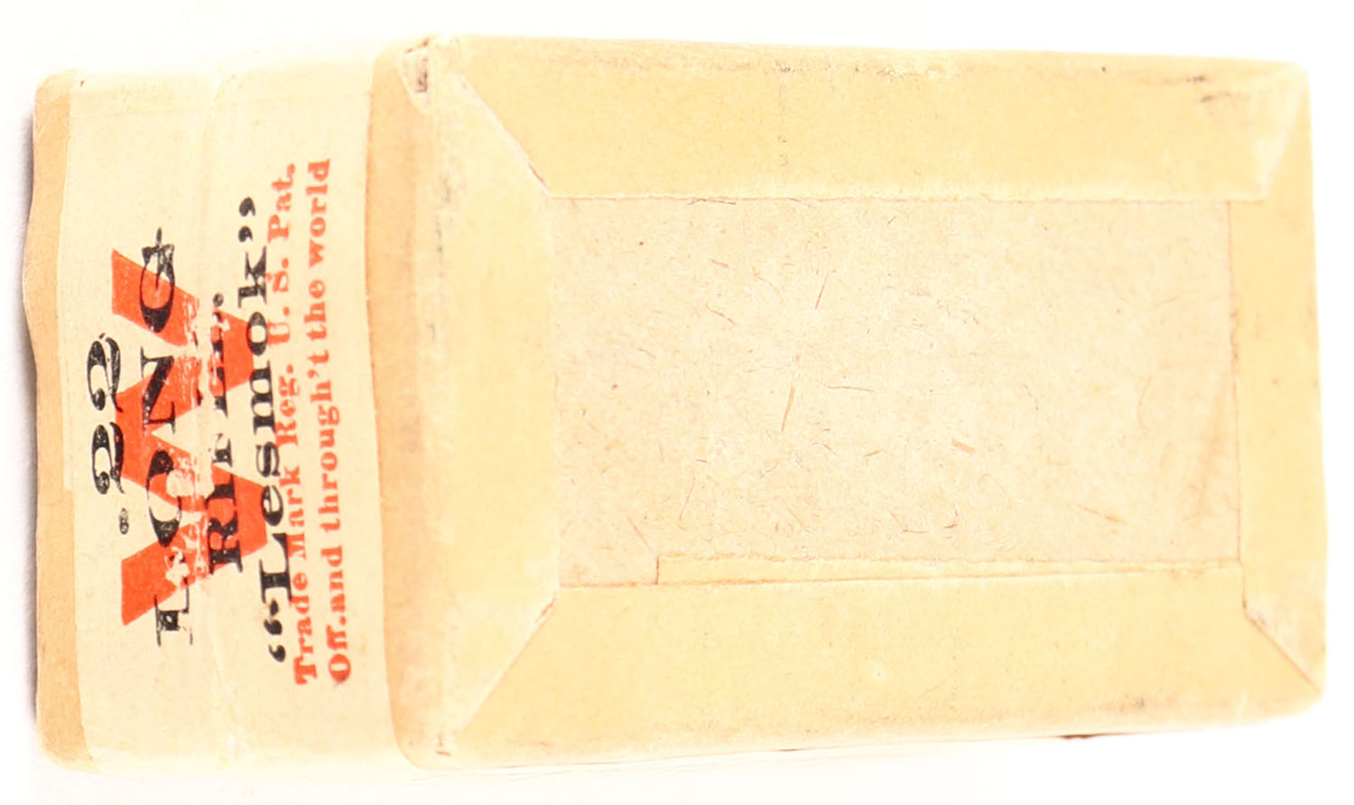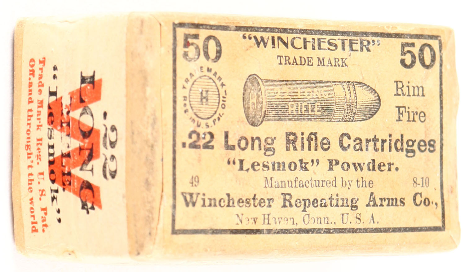 Winchester, .22 Long Rifle, ''Lesmok'' Powder, RR: 119 LR-22, FULL & SEALED, 2pc. Buff box with buff top & white side sealing labels, box is solid with excellent color, very minor age soiling & corner wear, edges are mostly crisp, box feels slightly swollen, labels are intact. Grade: Excellent - Value: 100 to 300