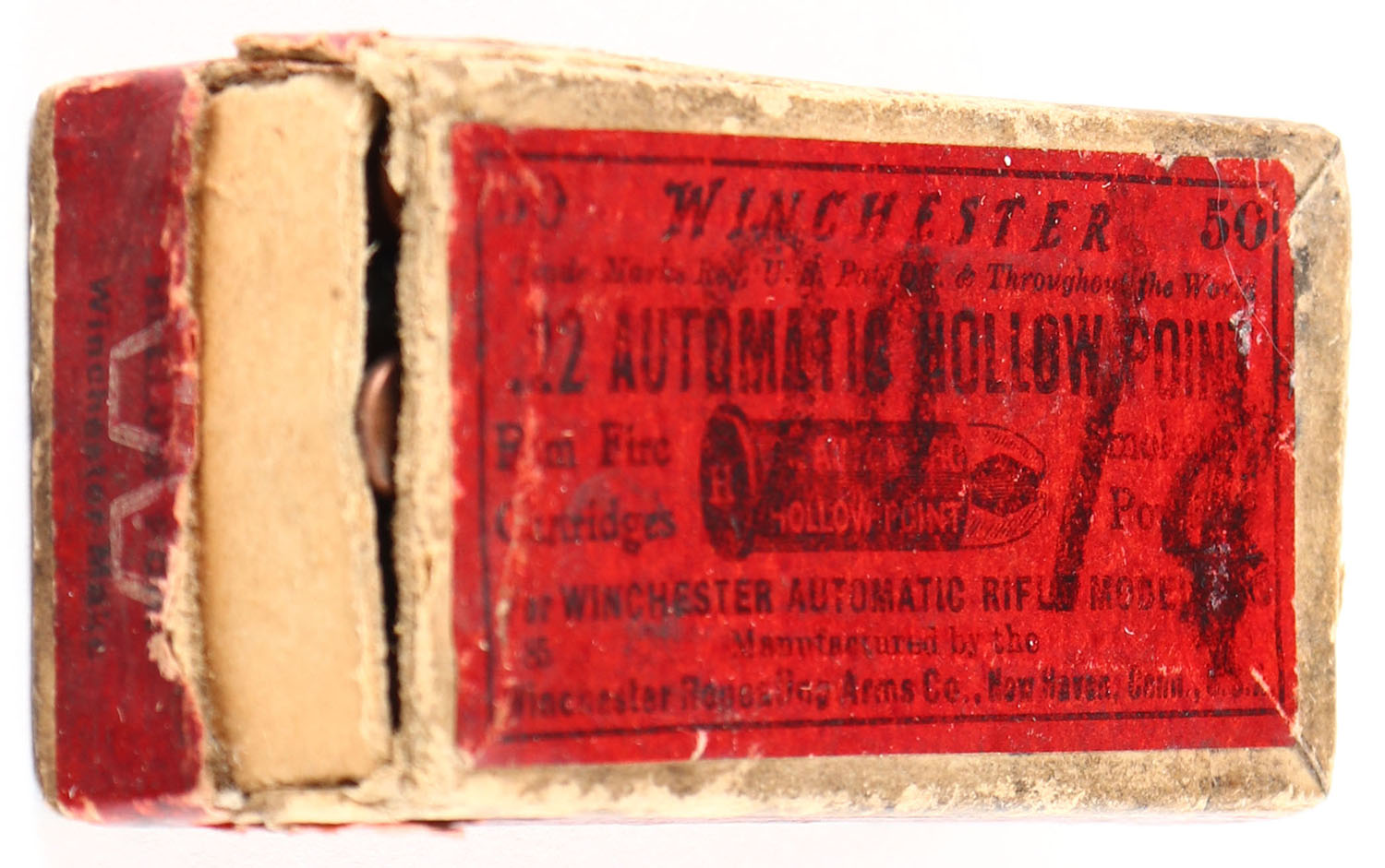 Winchester, Rim Fire Cartridges, .22 Automatic Hollow Point, RR: WRA-173 WA-16 Full, 2pc. Buff box with red top & side sealing labels, box is missing left end of lid, good color, age soiling, some shelf wear, top has been written on, edge & corner wear, labels are 99% intact, ammo is very good to excellent. Grade: Good + - Value: 40 to 200