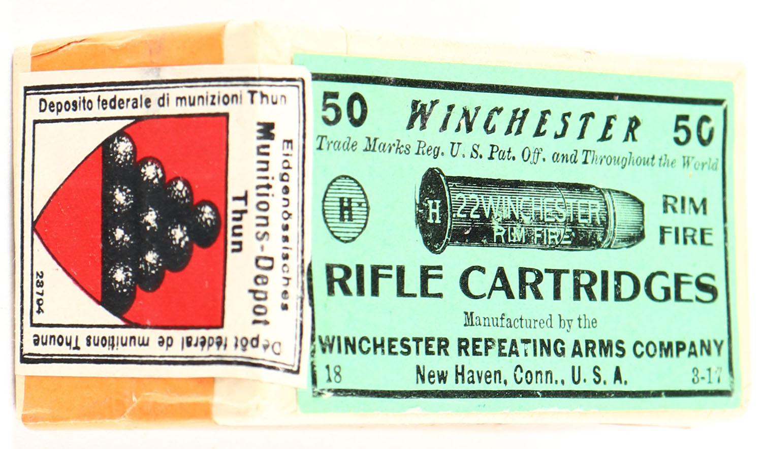 Winchester, Rifle Cartridges, ,22 Winchester Rim Fire, RR: WRA-157 WRF-25a, FULL & SEALED, 2pc. Buff box with green top & orange side sealing labels, Swiss tax stamp on left end, box is MINT with mint color, corners are sharp, edges are crisp, labels are intact. Grade: MINT - Value: 200 to 600