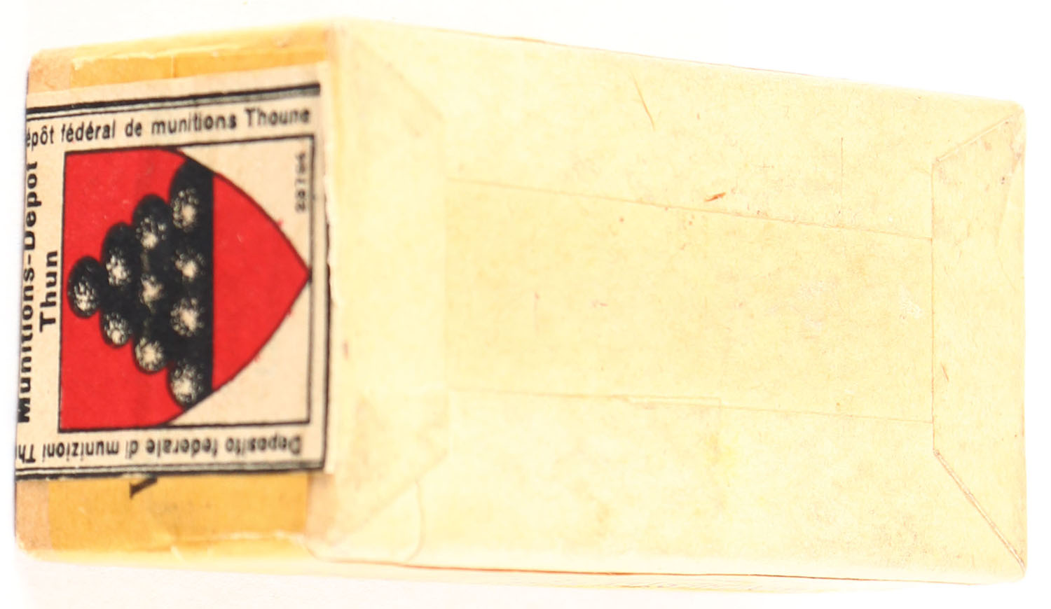 Winchester, ''Lesmok'' Rifle Cartridges, .22 Winchester Rim Fire, RR: WRA-159 WRF-32b, FULL & SEALED, 2pc. Buff box with green top & yellow side sealing labels, Swiss tax stamp on right end, box is solid with very good color, some age soiling, very minor corner wear, edges are crisp, labels are intact. Grade: Excellent + - Value: 50 to 200