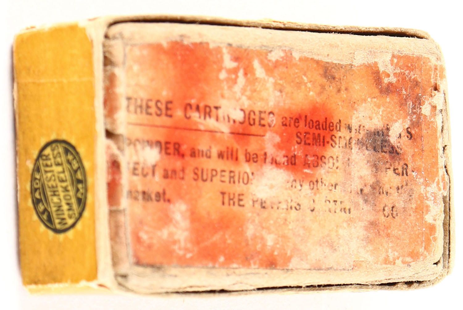 Winchester, Smokeless Rifle Cartridges, .22 Short RR: WRA-57 S-24d, Partial 49rds., 2pc. Buff box with green top & yellow side sealing labels, box is solid with good color, age soiling, shelf wear, appears as if a Peter's box has transferred its ink to bottom of box, some edge & corner wear, ammo is very good to excellent. Grade: Good - Value: 10 to 50
