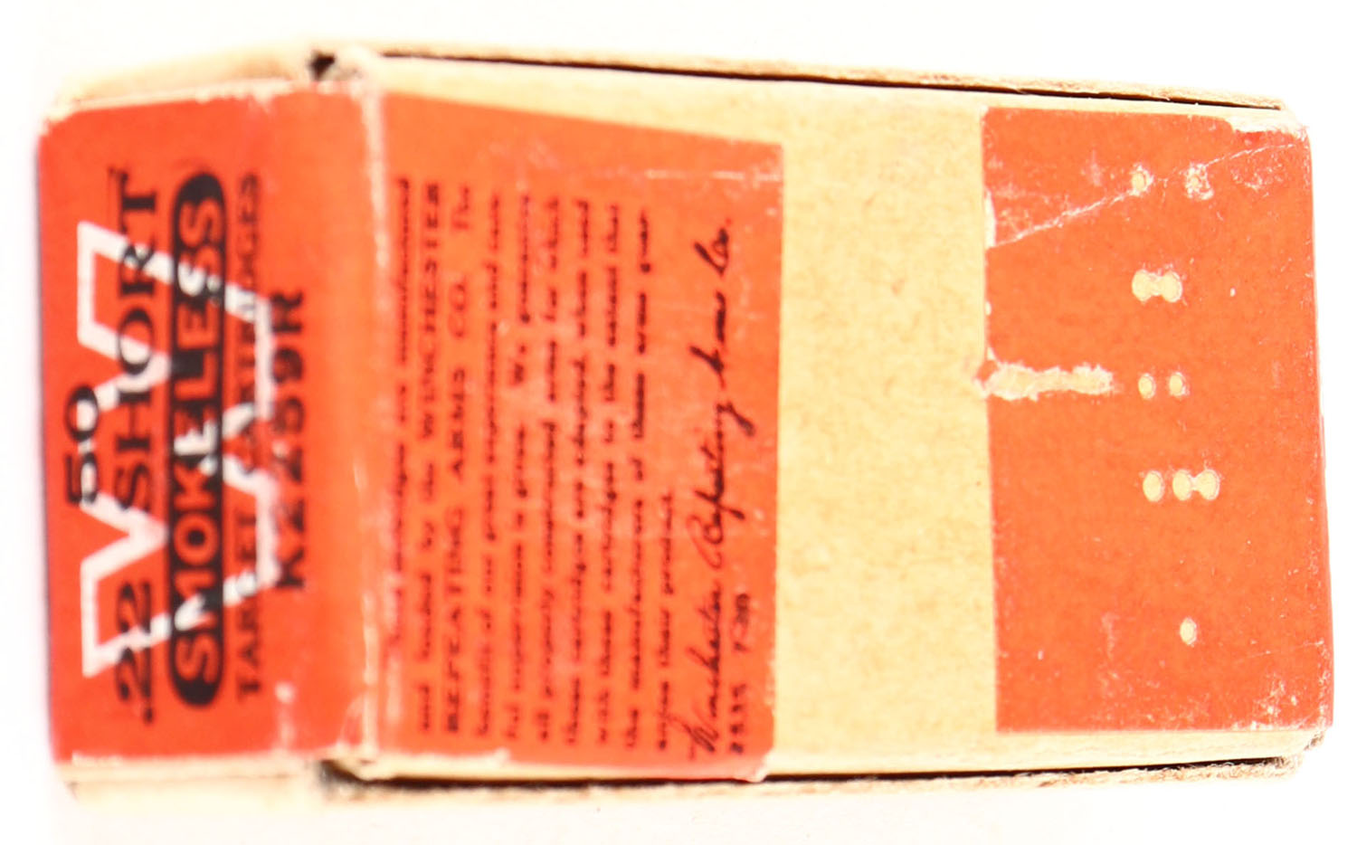 Winchester, Smokeless Rifle Cartridges, .22 Short, RR: WRA-177 S-62b, FULL & SEALED, 2pc. Buff box with red wraparound label, box is solid with excellent to minty color, only very minor shelf wear, very minor peeling to label on bottom, corners are mostly sharp, edges are crisp, label is intact. Grade: Excellent ++ - Value: 100 to 300