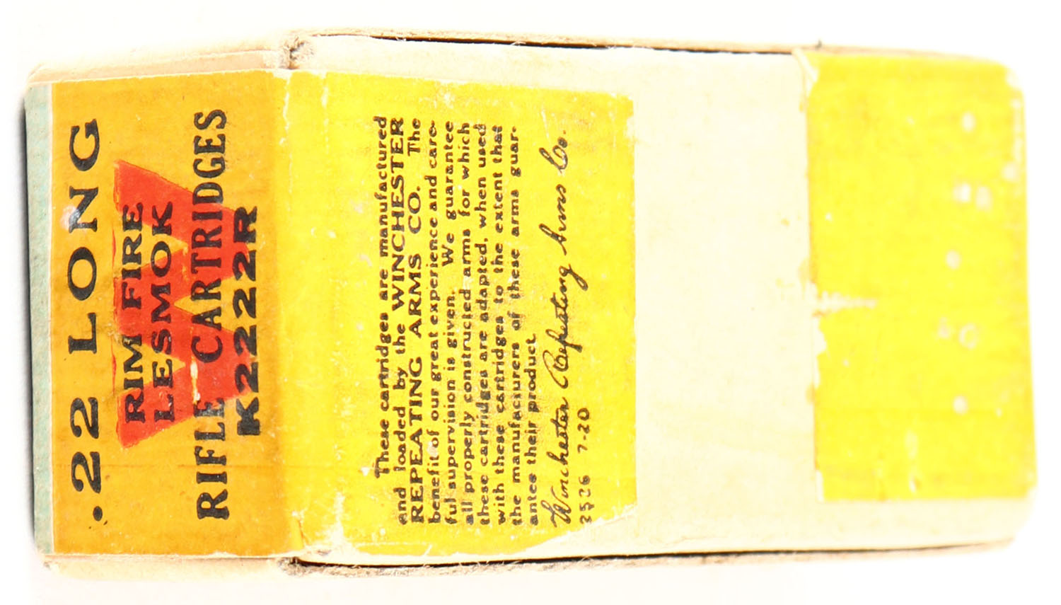 Winchester, .22 Long, Lesmok Rifle Cartridges, RR: WRA-179L-58b, FULL & SEALED, 2pc. Buff box with green & yellow wraparound label, box is solid with excellent color, only very minor age soiling, very minor corner wear, edges are mostly crisp, labels are intact. Grade: Excellent ++ - Value: 100 to 300