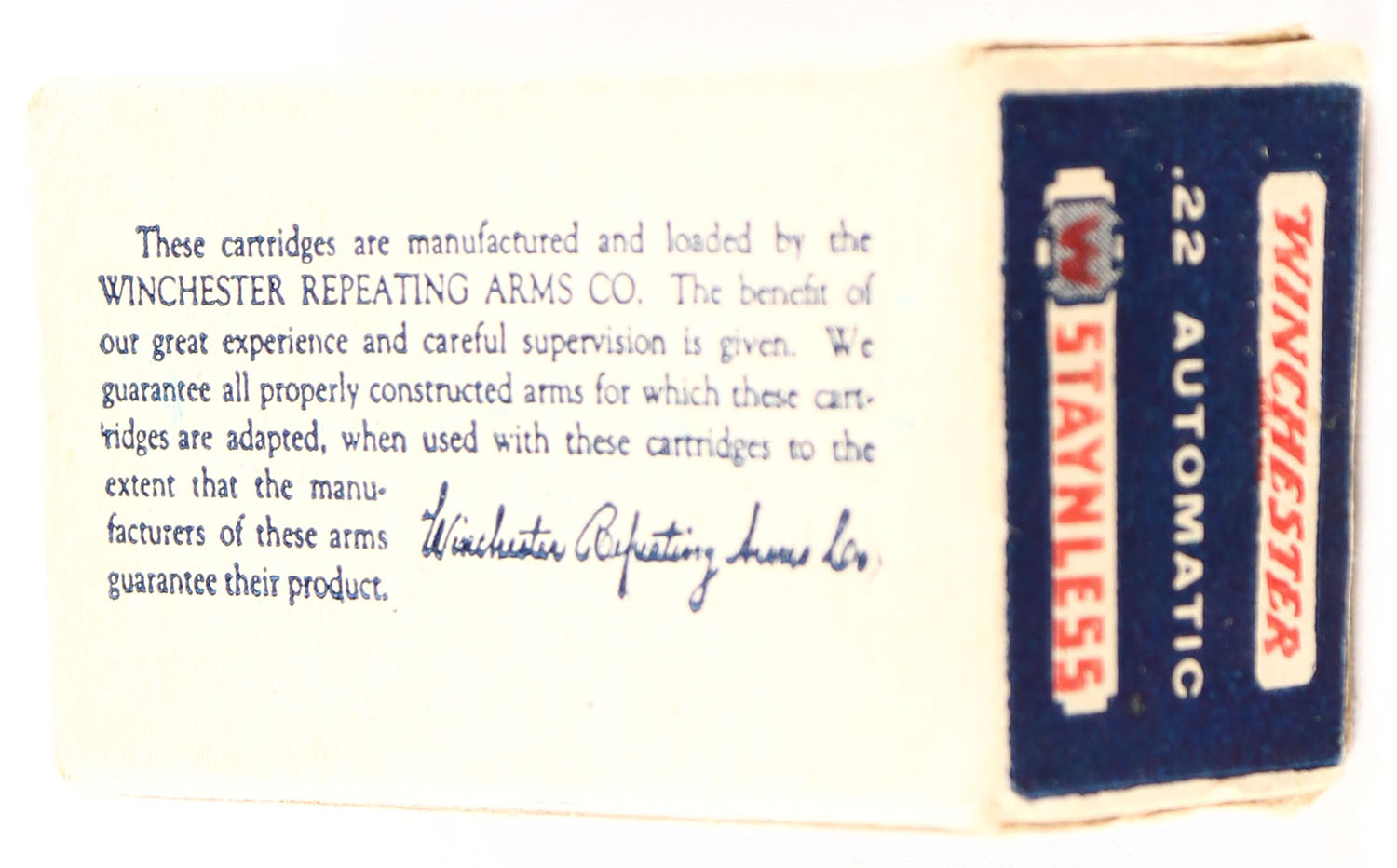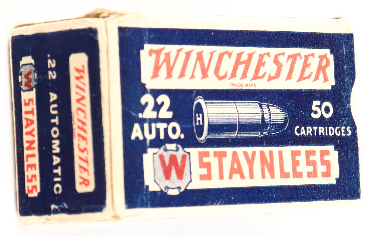 Winchester, Staynless, .22 Auto., RHWeb: WRA-12A WA-1, Full, 1pc., blue white & red box, box is solid with excellent color, very minor age soiling, some corner wear, edges are mostly crisp, end flaps are solid, ammo is excellent. Grade: Excellent - Value: 80 to 240