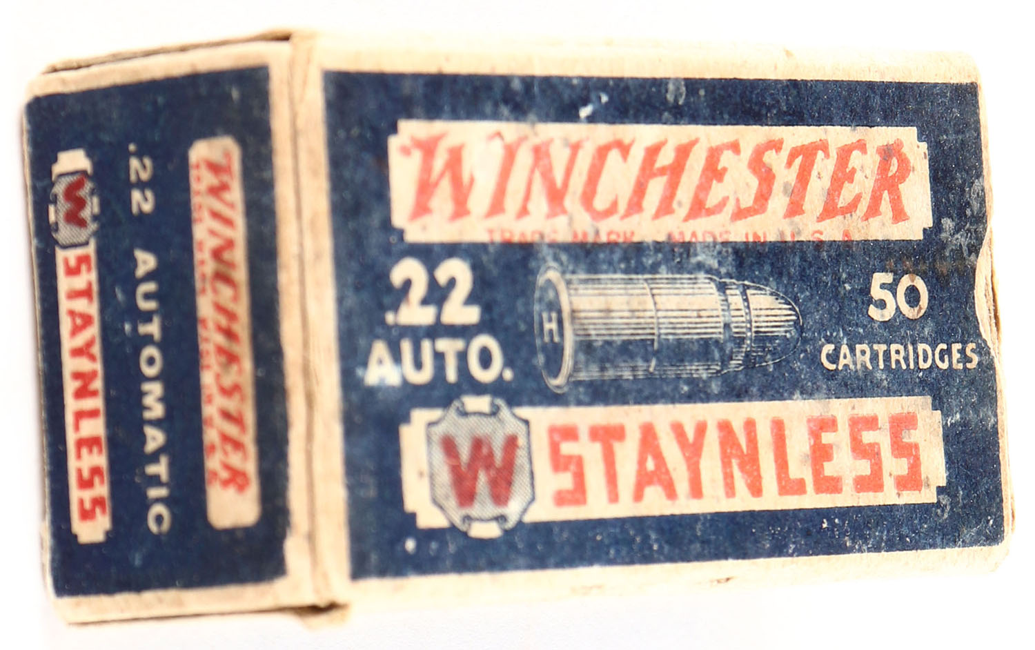 Winchester, Staynless, .22 Auto., RHWeb: WRA-12B WA-1b, Full, 1pc. Blue white & red box, box is solid with good to very good color, age soiling & shelf wear, some corner wear, minor edge wear, end flaps are solid, ammo is excellent. Grade: Very Good - Value: 40 to 120