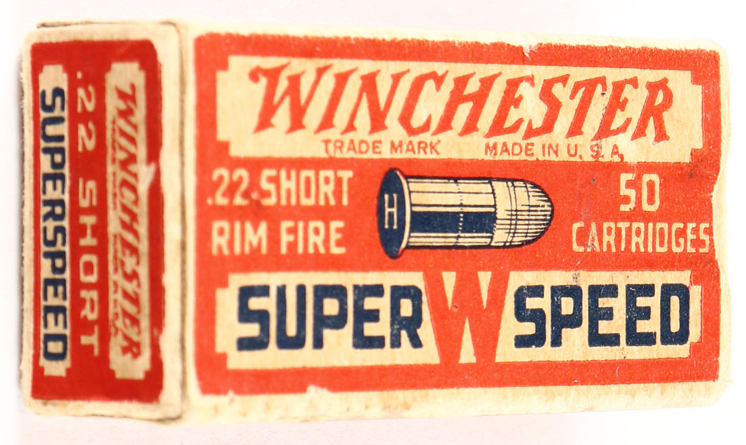 Winchester, Super Speed, .22 Short, RHWeb: WRA-13 S-1b, Full, 1pc. Red white & blue box, box is solid with very good color, some age soiling, some edge & corner wear, end flaps are solid, ammo is excellent. Grade: Very Good ++ - Value: 50 to 200