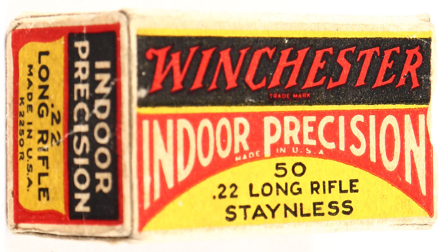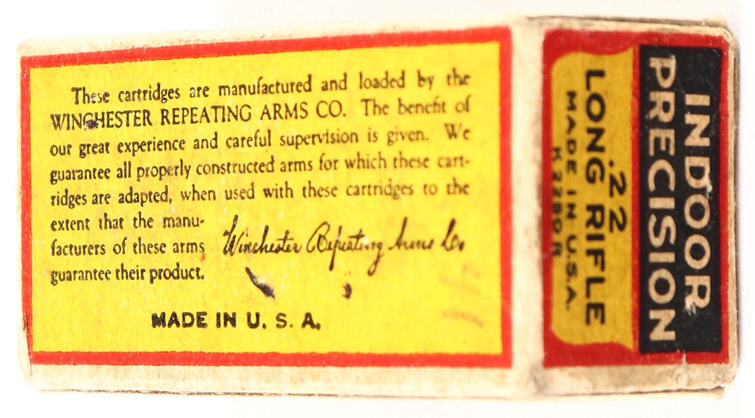 Winchester, Indoor Precision, .22 Long Rifle, RHWeb: WRA-53 LR-8, Full, 1pc. Yellow red & black box, box is solid with very good color, some age soiling, partial seam split to top front corner, some corner wear, minor edge wear, end flaps are solid, ammo is very good. Grade: Very Good ++ - Value: 500 to 1500