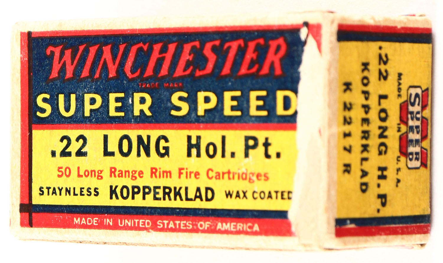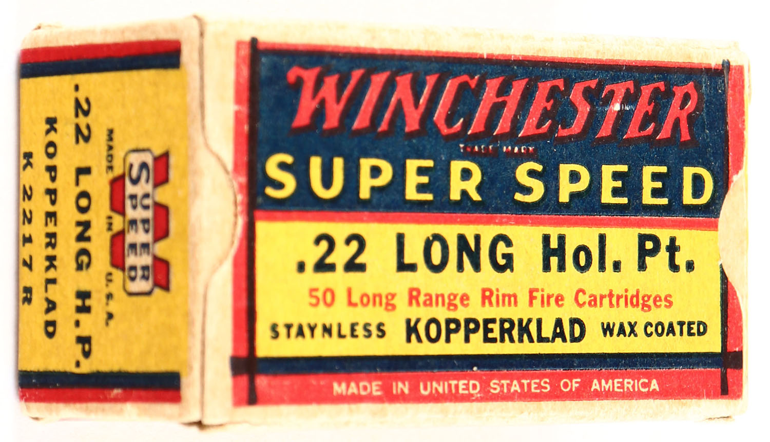 Winchester, Super Speed, .22 Long Hollow Point, RHWeb: WRA-14B L-3 Full, 1pc. Yellow blue & red box, box is solid with excellent color, minor age soiling, some edge & corner wear, end flaps are solid, ammo is excellent. Grade: Excellent - Value: 40 to 120