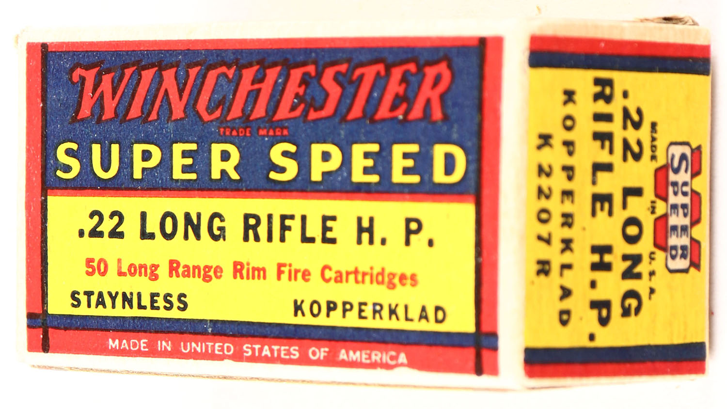 Winchester, Super Speed, .22 Long Rifle Hollow Point, RHWeb: WRA-16 LR-2b, Full, 1pc. Yellow blue & red box, box is solid with excellent to minty color, very minor corner wear, edges are crisp, end flaps are solid, ammo is excellent. Grade: Excellent ++ - Value: 20 to 60