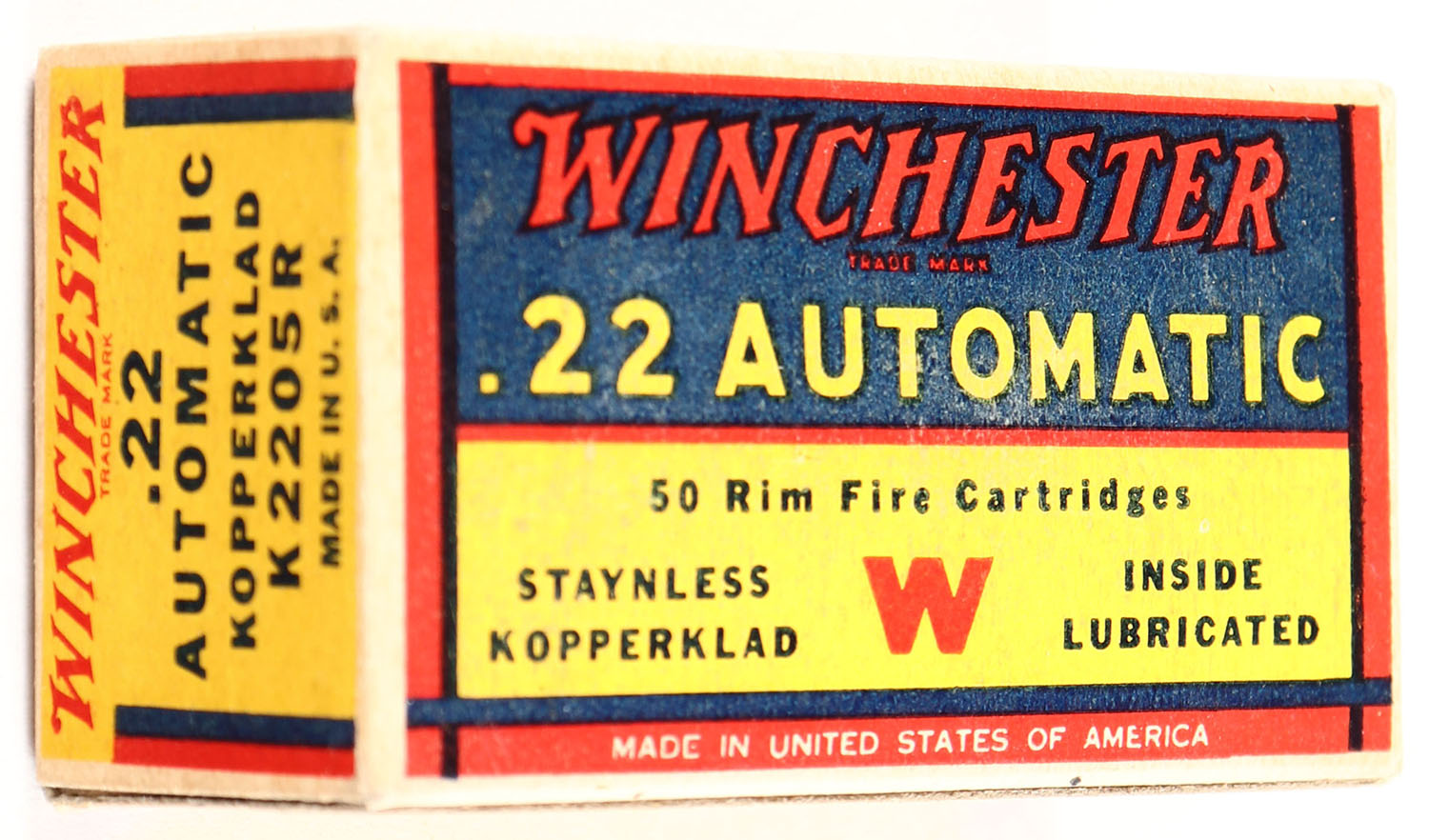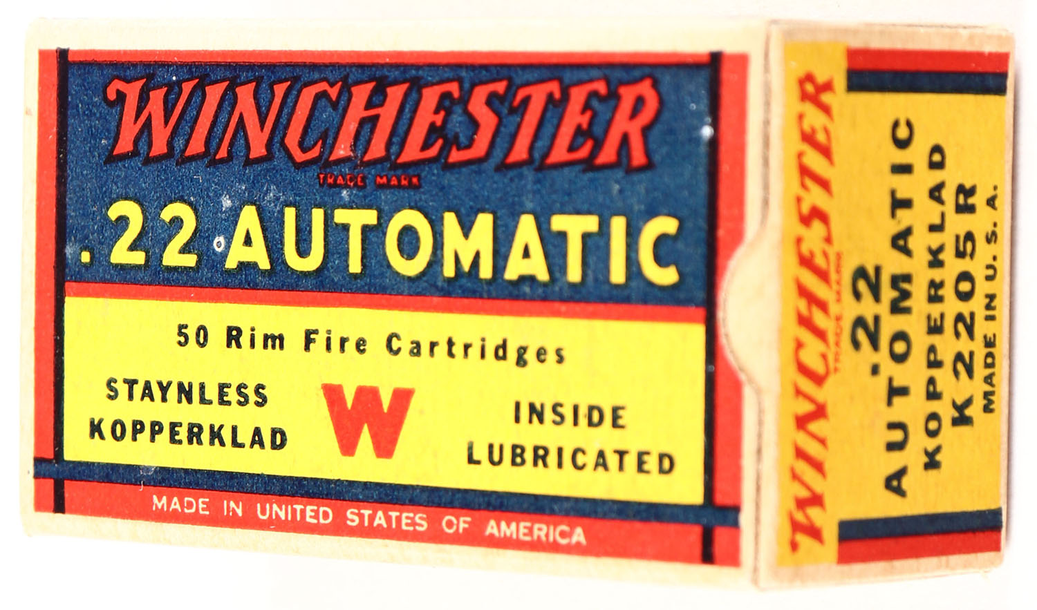 Winchester, .22 Automatic, Staynless Kopperklad, RHWeb: WRA-15 WA-1b, Full, 1pc. Yellow blue & red box, box is near mint with excellent to minty color, only very minor age soiling corners are sharp, edges are crisp, end flaps are solid, ammo is excellent to minty. Grade: Excellent ++ - Value: 20 to 60