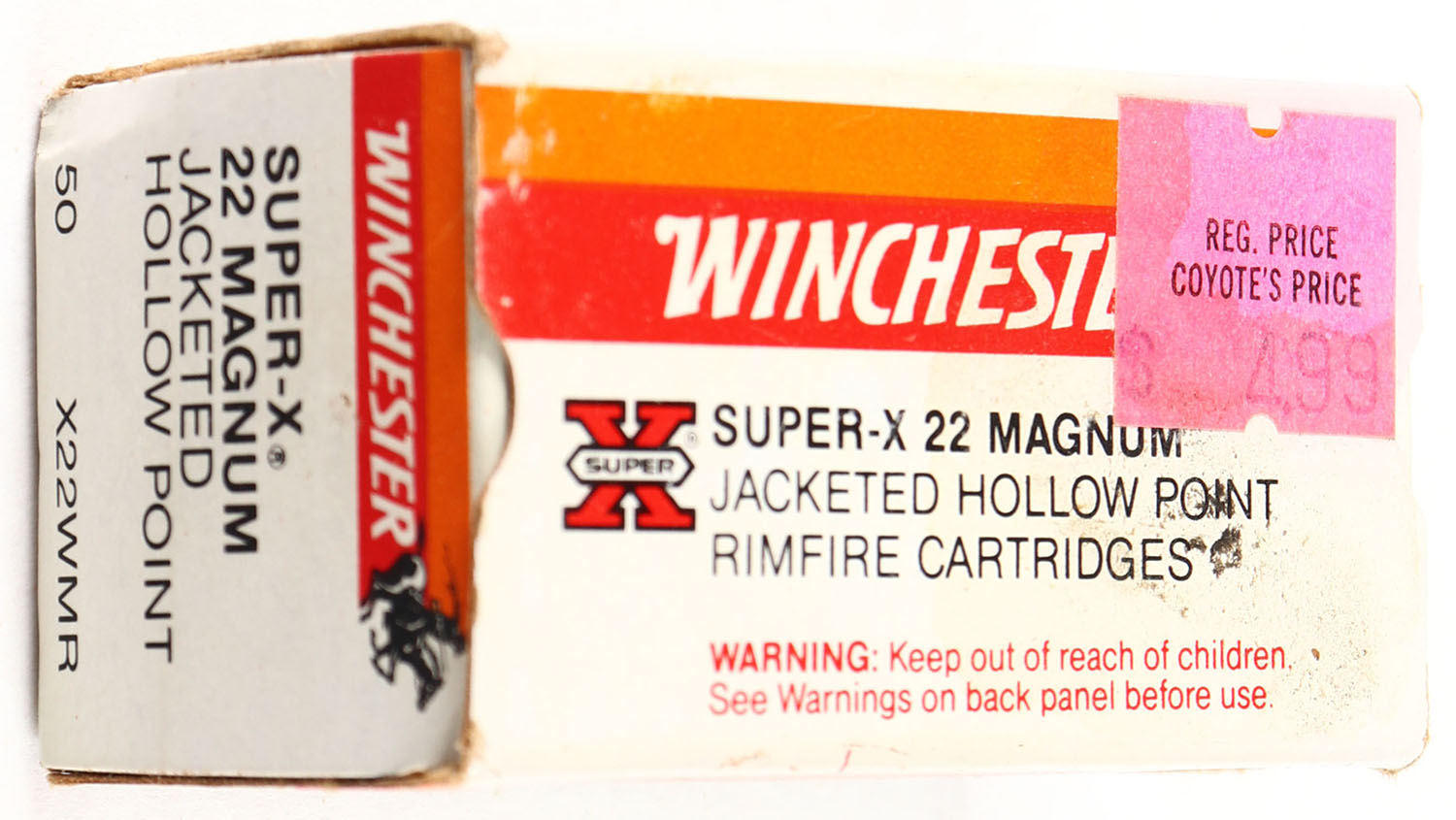 Winchester, Super-X, .22 Magnum, Jacketed Hollow Point, RHWeb: WRA-H&R-1D WMR-2, Full, 1pc. Off-white red & orange box, box is solid with very good color, some staining & corner wear, very minor edge wear, retail sticker on top, end flaps are solid, ammo is very good. Grade: Very Good + - Value: 6 to 30