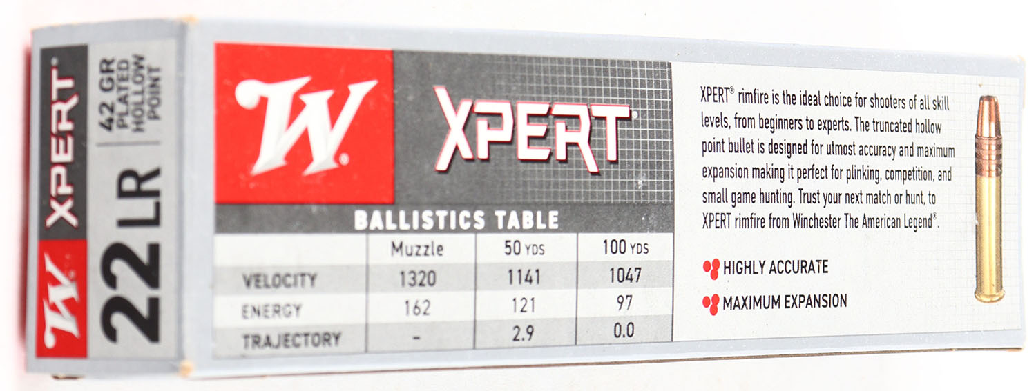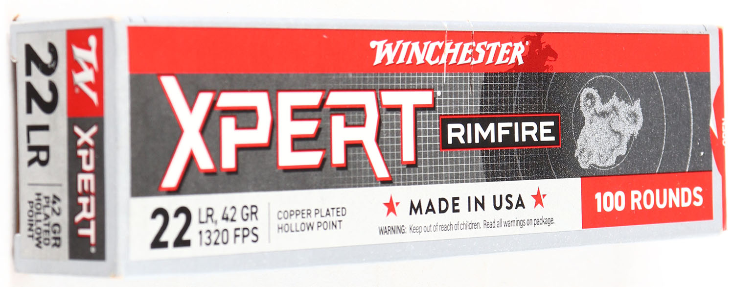 Winchester, Xpert, .22 Long Rifle, 42 Grain Copper Plated Hollow Point, 1320 FPS, Full, 100rds., 1pc. Gray red & white box, box is MINT with minty color, corners are sharp, edges are crisp, end flaps are solid, ammo is mint. Grade: MINT - Value: 20 to 80