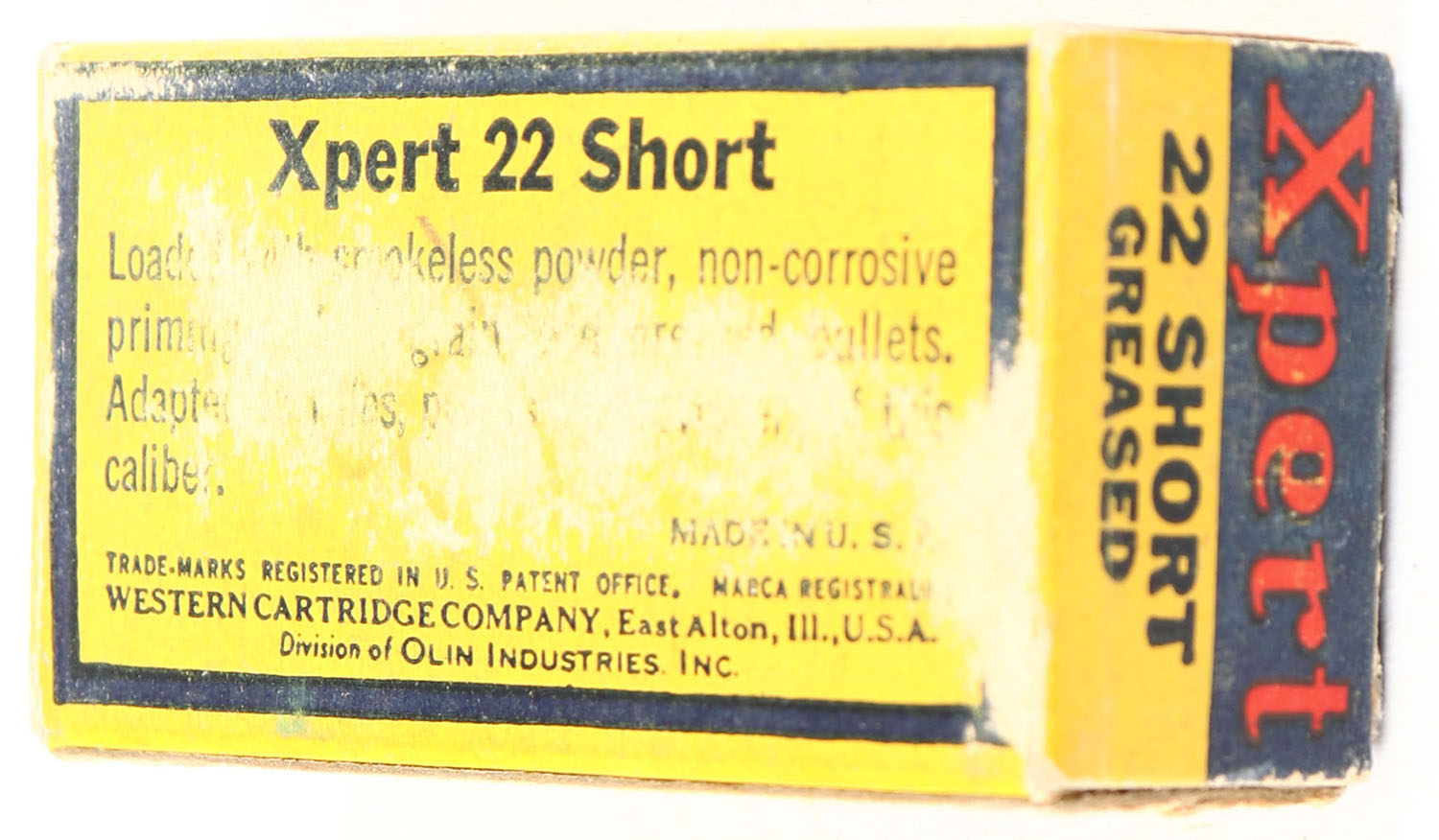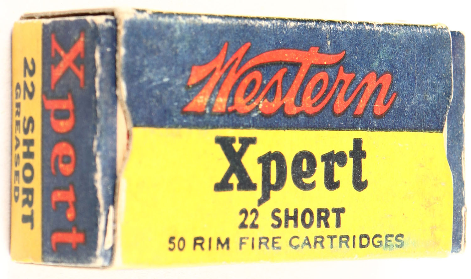 Western, Xpert, .22 Short, Greased, RHWeb: WCC-52 S-1e, Full, 1pc. Yellow blue & red box, box is solid with very good color, some age soiling & shelf wear, minor corner wear, edges are mostly crisp, end flaps are solid, ammo is very good. Grade: Very Good ++ - Value: 6 to 30