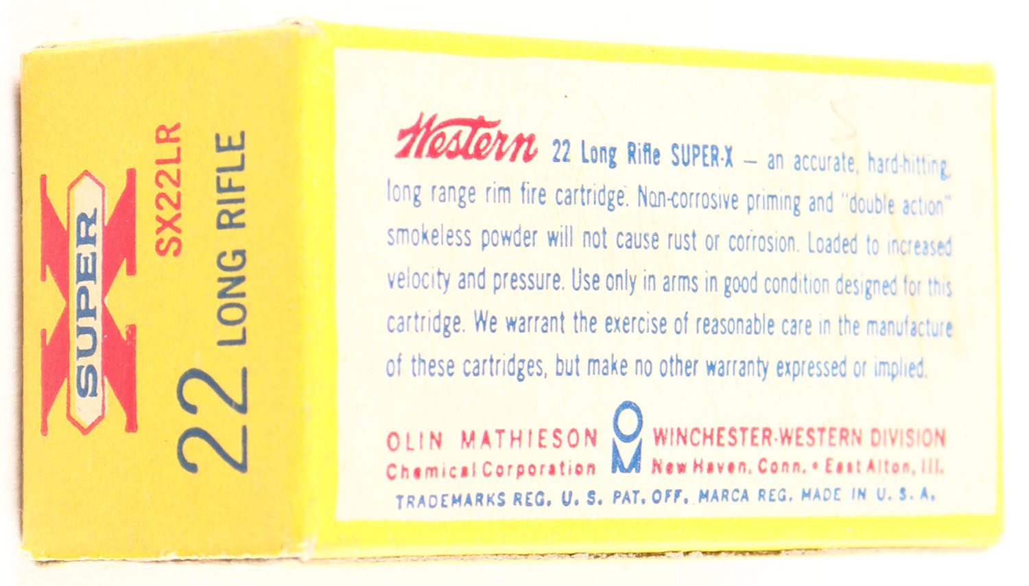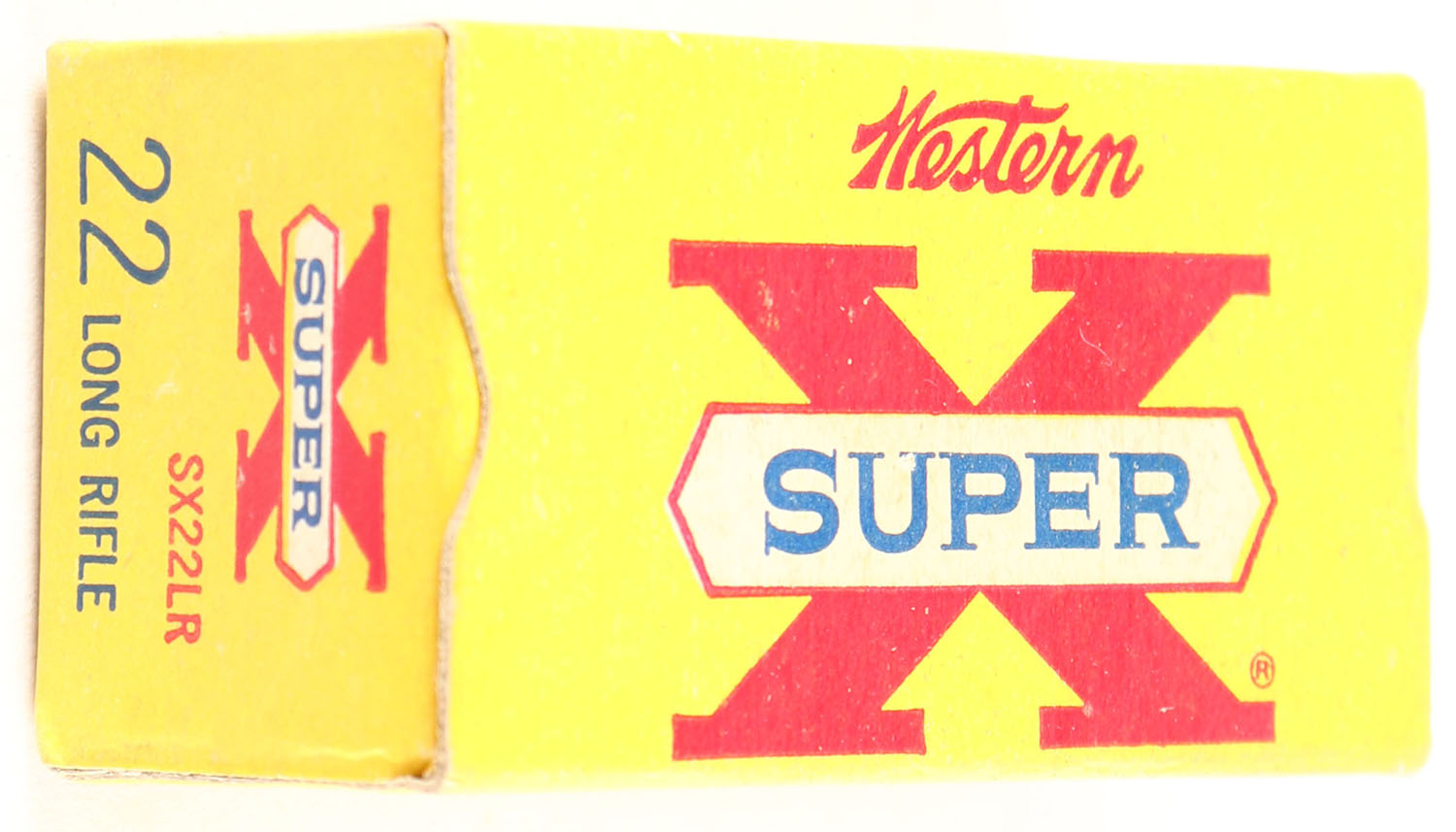 Western, Super X, .22 Long Rifle, 40 Grain Lubaloy Coated Bullet, RHWeb: WCC-11 LR-1a, Full, 1pc. Yellow white & red box, box is solid with very good to excellent color, some age soiling, corners are mostly sharp, edges are crisp, end flaps are solid, ammo is minty. Grade: Excellent ++ - Value: 10 to 50