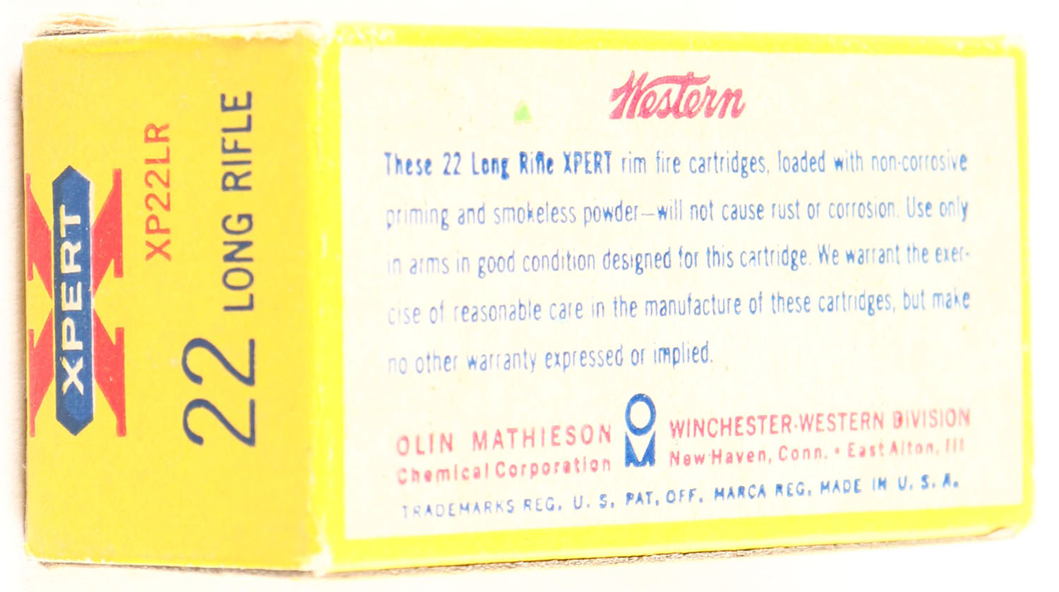 Western, Xpert, .22 Long Rifle, 40 Grain Special Lubricant, RHWeb: WCC-52 LR-2a, Full, 1pc. Yellow red & blue box, box is solid with excellent color, very minor age soiling & shelf wear, corners are mostly sharp, edges are crisp, end flaps are solid, ammo is minty. Grade: Excellent + - Value: 6 to 30