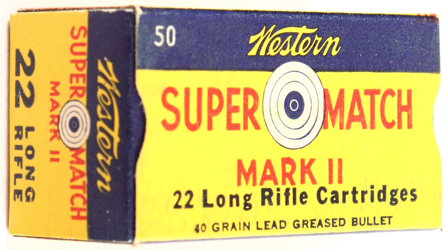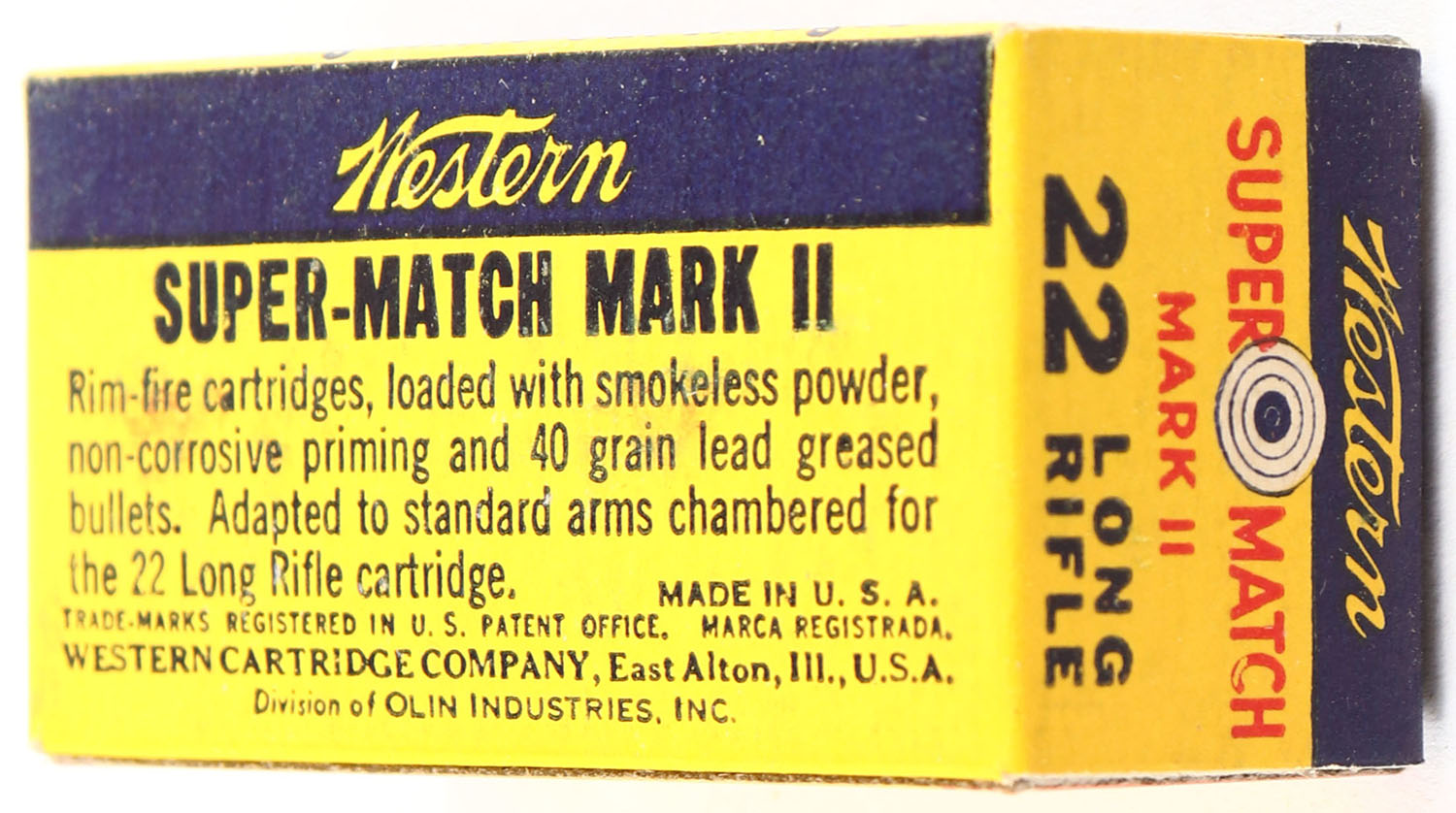 Western, Super Match Mark II, .22 Long Rifle, RHWeb: WCC-51.2 LR-3g, Full, 1pc. Yellow blue & red box, box is near mint with minty color, only very minor color bleeding, corners are sharp, edges are crisp, end flaps are solid, ammo is excellent. Grade: Excellent + - Value: 10 to 50