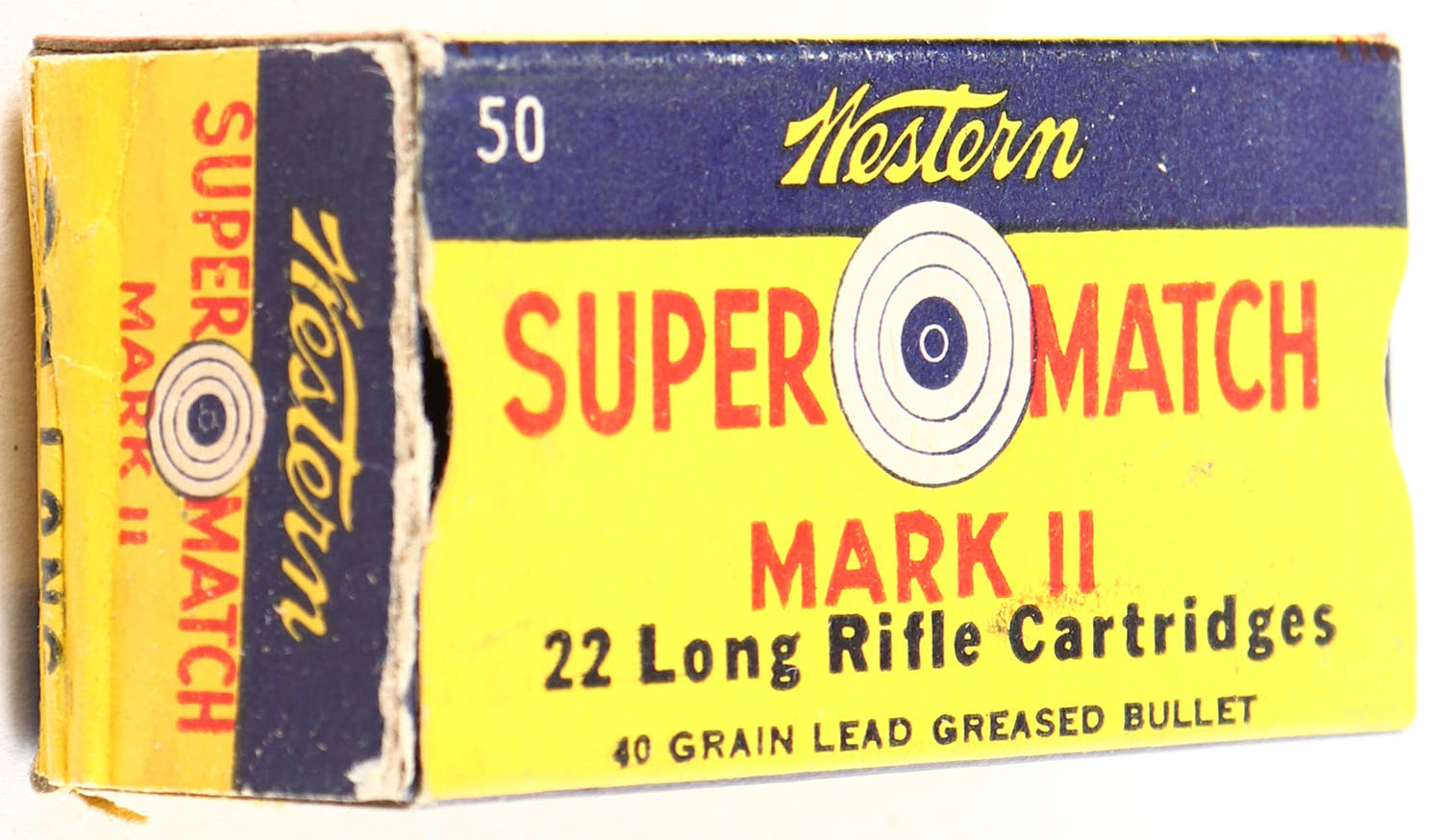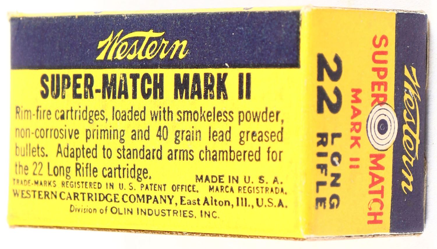 Western, Super Match Mark II, .22 Long Rifle, RHWeb: WCC-51.2 LR-3g, Full, 1pc. Yellow blue & red box, box is solid with excellent color, some color bleeding, corners are mostly sharp, edges are crisp, damage to one flap, ammo is excellent. Grade: Excellent - Value: 8 to 40