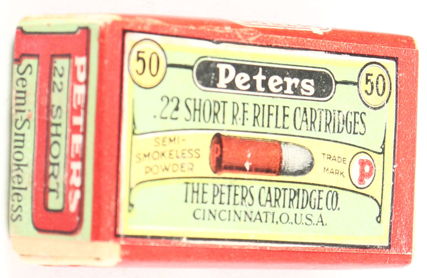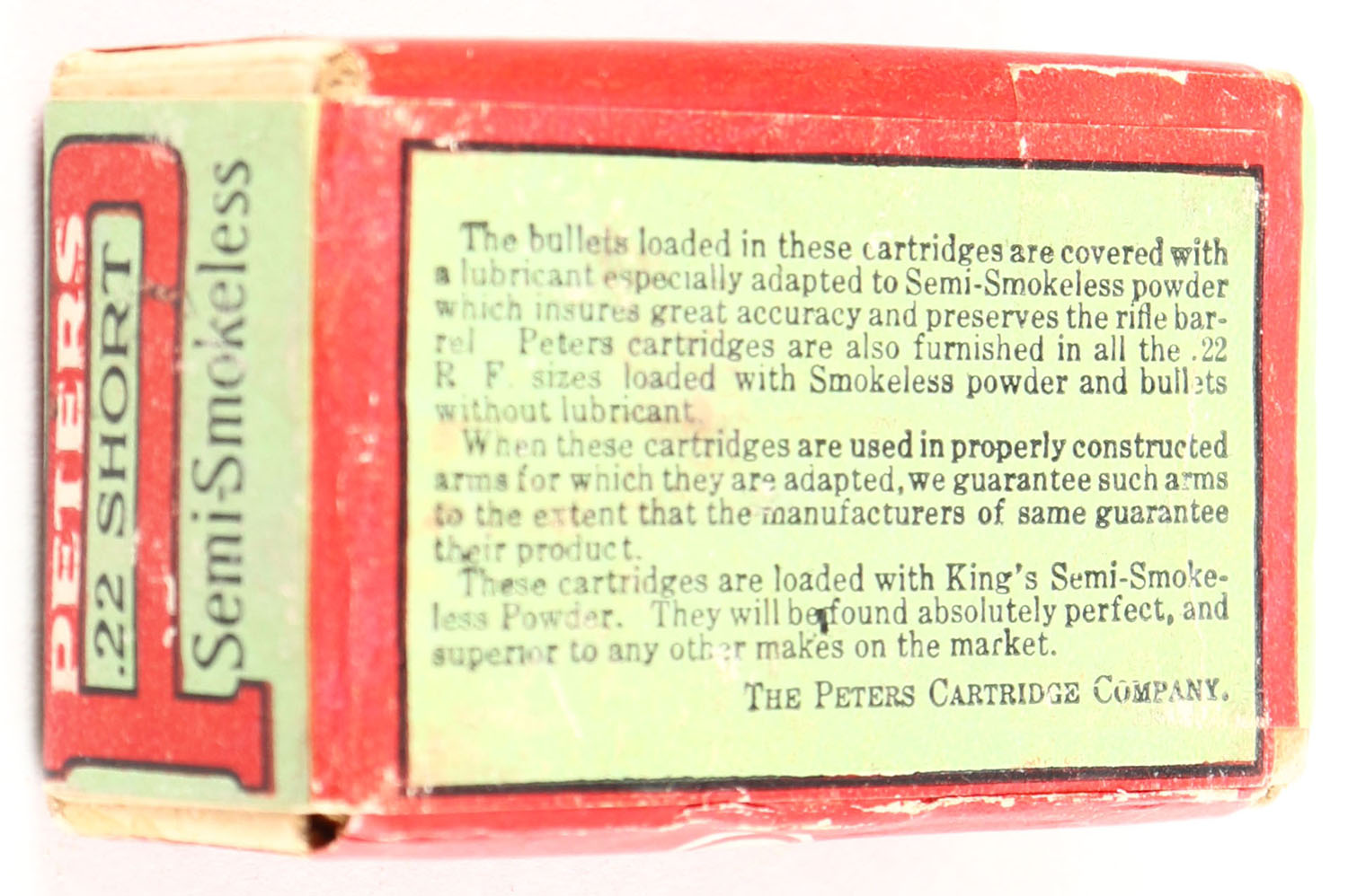 Peters, .22 Short, Semi-Smokeless Powder, RHWeb: PCC-5A S-1b, FULL & SEALED, 2pc. Buff box with red & green full cover label, box is solid with excellent color, very minor shelf wear, corners are sharp, edges are crisp, label is intact. Grade: Excellent + - Value: 50 to 150