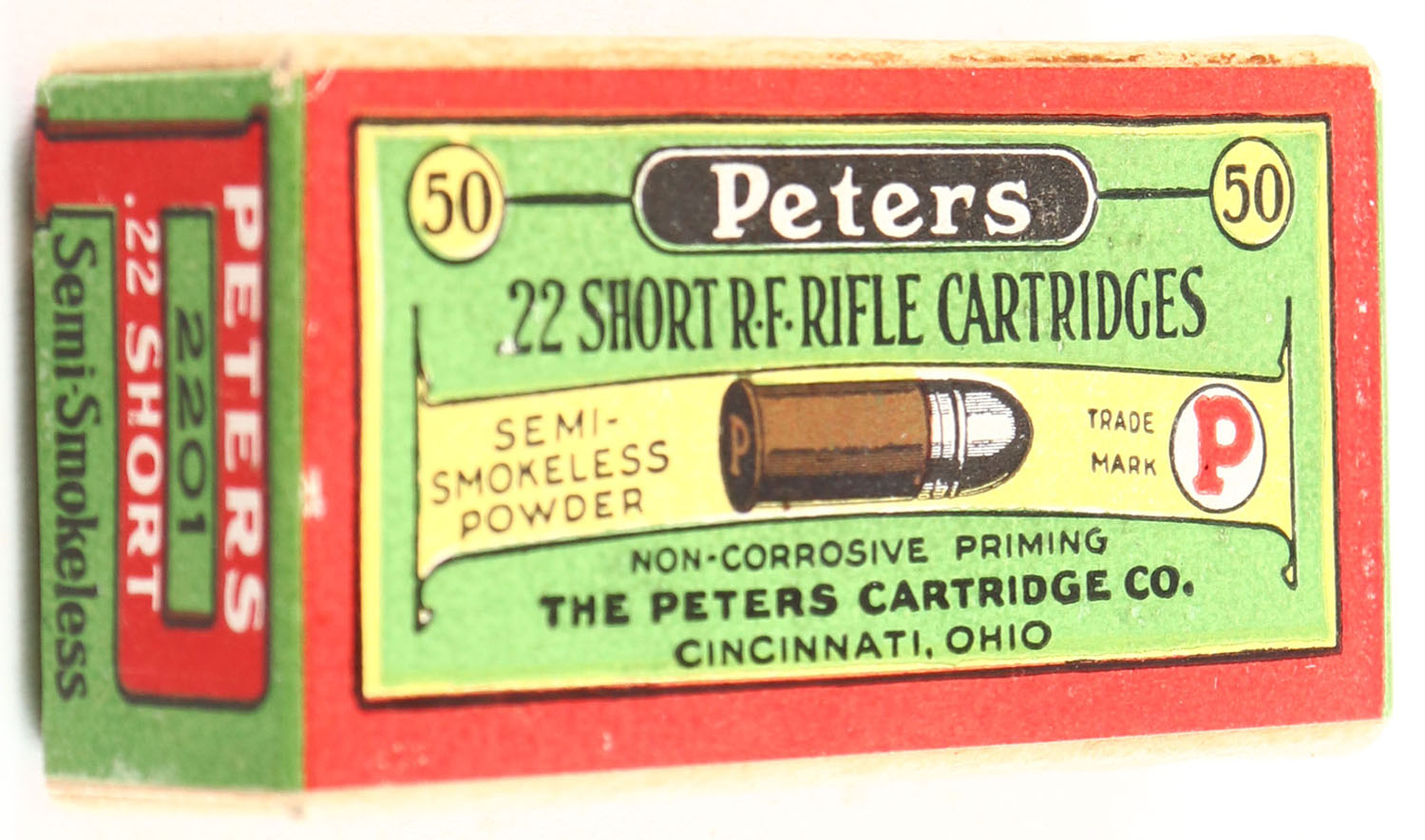 Peters, R.F. Rifle Cartridges, .22 Short, Semi-Smokeless Powder, RHWeb: PCC-5B S-1c, Full, 2pc. Buff box with green red & yellow wraparound label, box is solid with minty color, corners are sharp, edges are crisp, label is intact, ammo is excellent. Grade: Excellent ++ - Value: 40 to 120