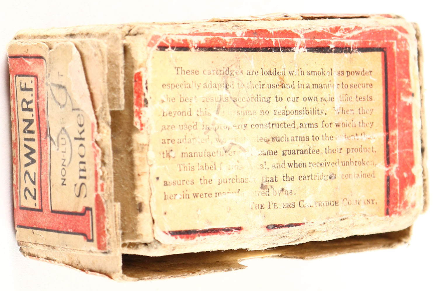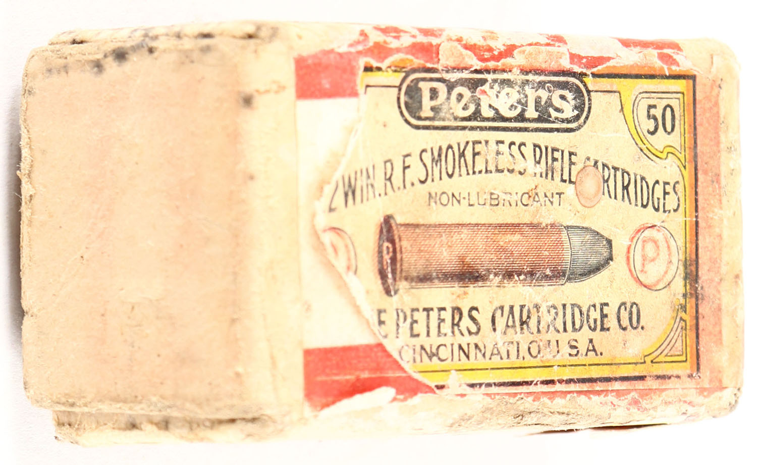 Peters, R.F. Smokeless Rifle Cartridges, .22 W.R.F., Non-Lubricant, RHWeb: PCC-5A WRF-5, Full, 2pc. Buff box with off-white & red full wraparound label, all factory seams of lid have unadhered, good color, age soiling, staining, edge & corner wear, label is 60% intact, ammo is good. Grade: Fair ++ - Value: 20 to 60