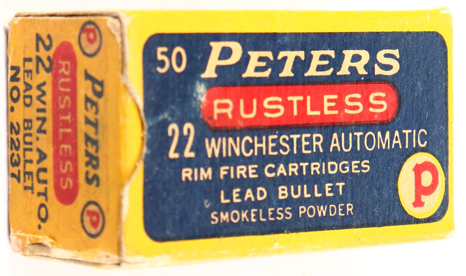 Peters, Rustless, .22 Winchester Automatic, Bridgeport, RHWeb: PCC-8D WA-3a, Partial 45rds., 1pc. Blue yellow & red box, box is solid with very good color, some age soiling & corner wear, very minor shelf wear, edges are mostly crisp, end flaps are solid, ammo is excellent. Grade: Very Good ++ - Value: 10 to 50