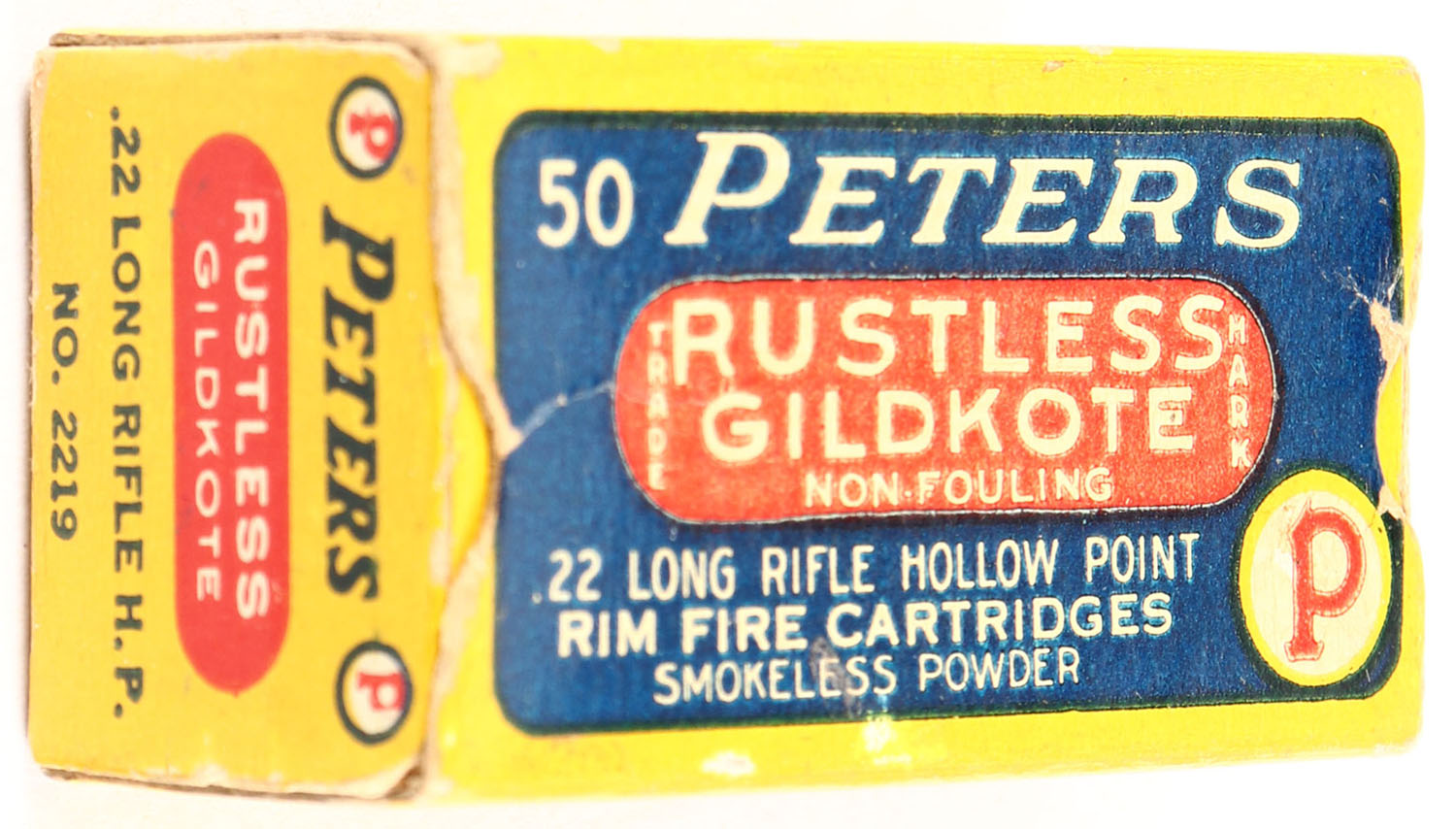 Peters, Rustless Gildkote, .22 Long Rifle Hollow Point, Cincinnati O., RHWeb: PCC-10 LR-2, Full (Brass, PE-1 H/S), 1pc. Blue yellow & red box, box is solid with excellent color, very minor age soiling, very minor edge & corner wear, end flaps are solid, ammo is excellent. Grade: Excellent - Value: 10 to 50