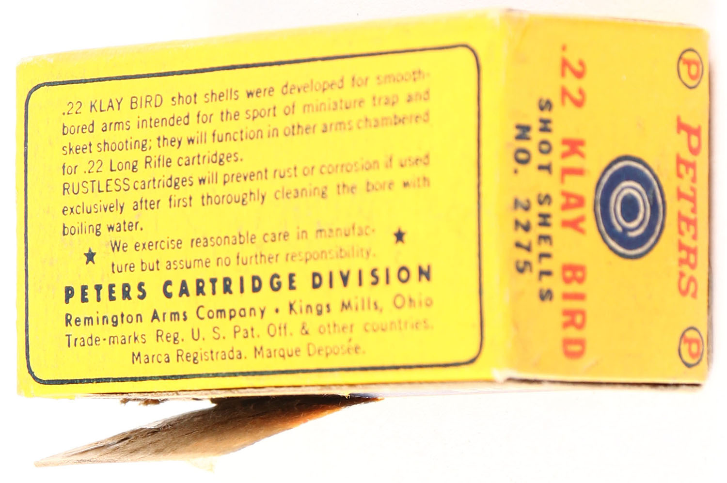 Peters, High Velocity Klay Bird, .22 Long Rifle Shot, Kings Mills, RHWeb: PCC-14 LR-4, Full, 1pc. Blue yellow & red box, box is solid with very good to excellent color, very minor age soiling, tear on back side, corners are mostly sharp, edges are crisp, end flaps are solid, ammo is very good to excellent. Grade: Very Good - Value: 40 to 120