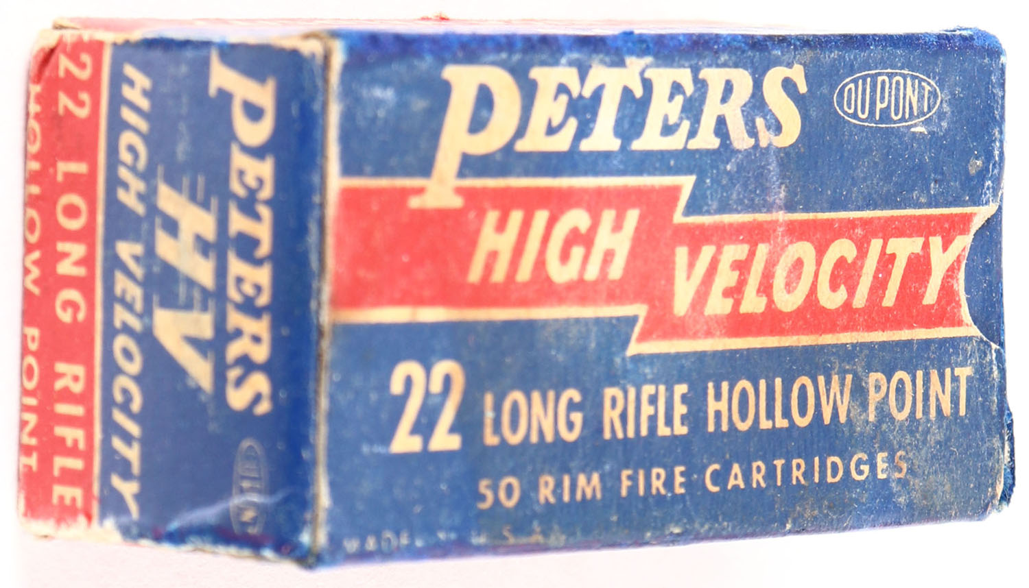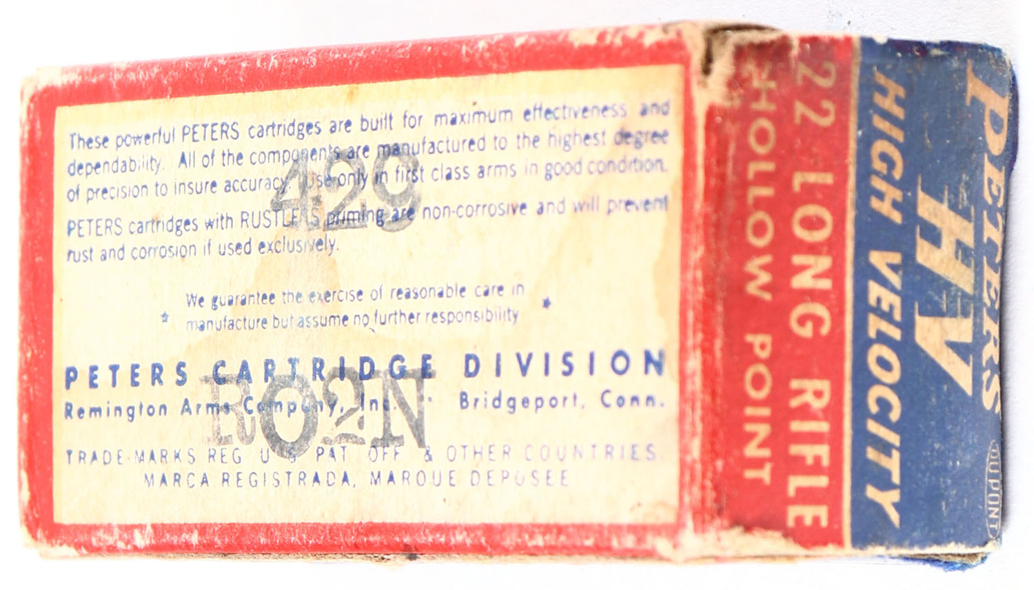 Peters, High Velocity, .22 Long Rifle Hollow Point, RHWeb: PCC-17 LR-3a, Full, 1pc. Blue red & white box, box is solid with very good color, some age soiling, minor edge & corner wear, end flaps are solid, ammo is excellent. Grade: Very Good ++ - Value: 10 to 50
