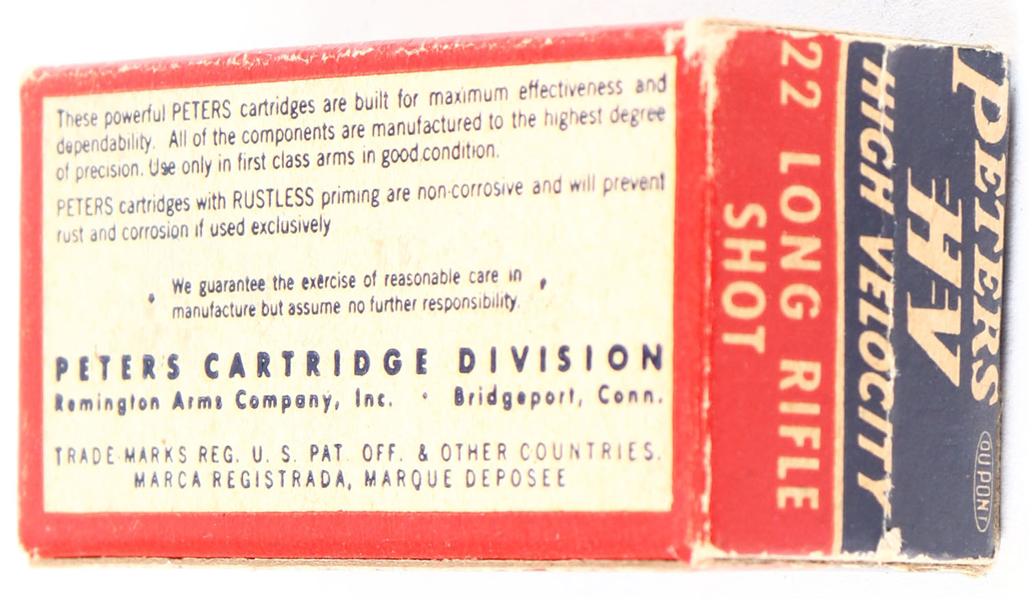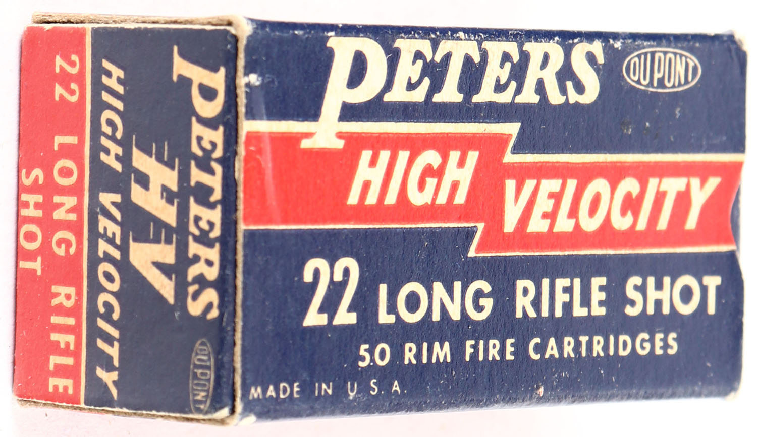 Peters, High Velocity, .22 Long Rifle Shot, RHWeb: PCC-17 LR-4c, Full, 1pc. Blue red & white box, box is solid with excellent color, very minor age soiling & corner wear, edges are mostly crisp, end flaps are solid, ammo is excellent to minty. Grade: Excellent + - Value: 20 to 60