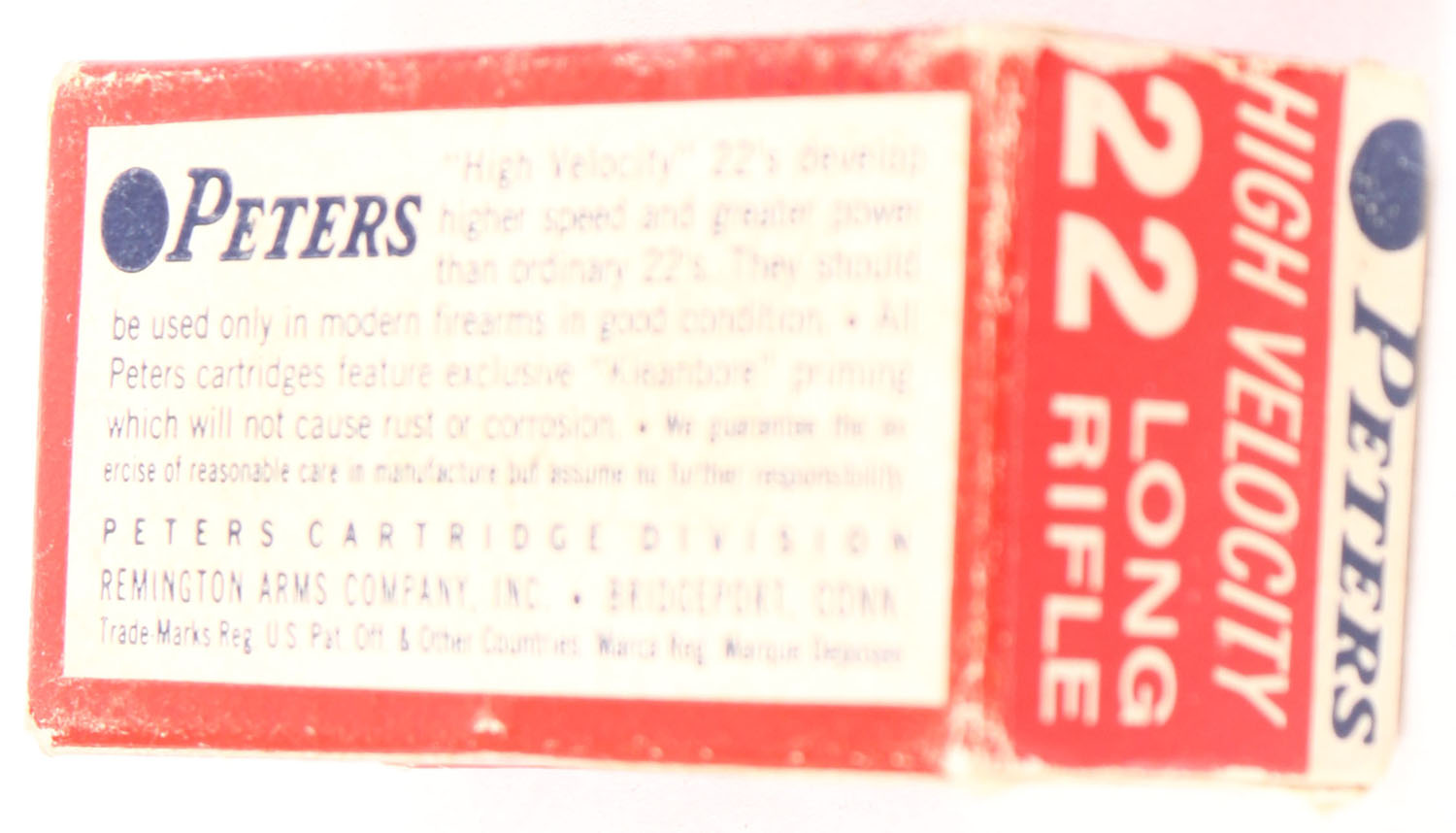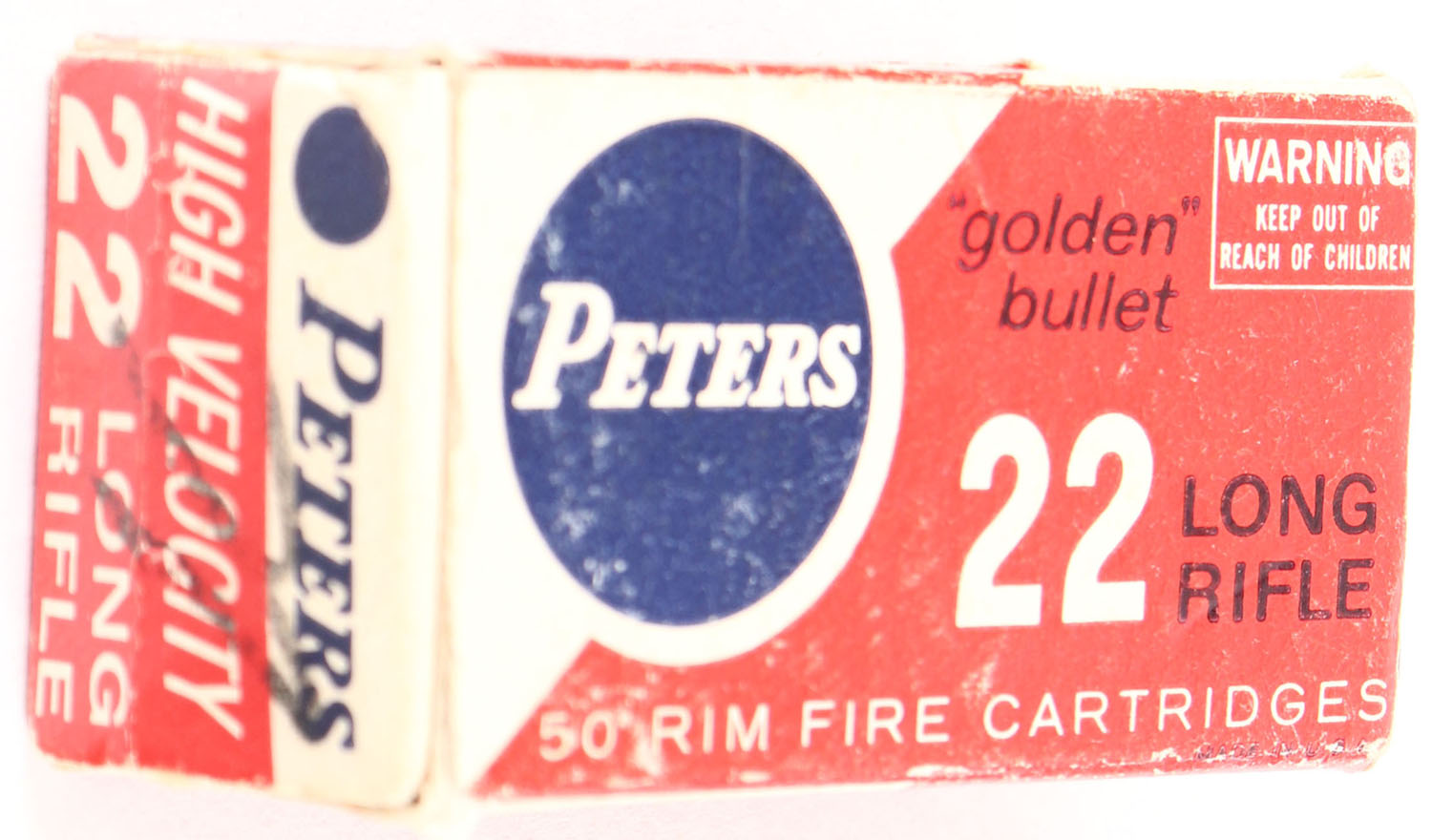 Peters, ''golden'' bullet, .22 Long Rifle, RHWeb: PCC-20 LR-1b, Full, 1pc. Red white & blue box, box is solid with very good color, minor age soiling & shelf wear, minor edge & corner wear, end flaps are solid, ammo is excellent. Grade: Very Good ++ - Value: 6 to 30