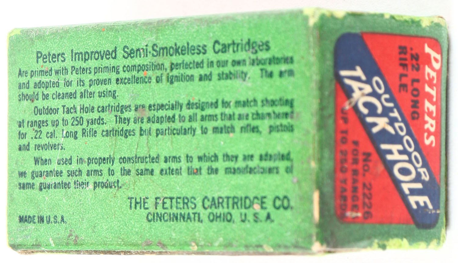 Peters, Outdoor Tack Hole, .22 Long Rifle, Improved Semi-Smokeless, Cincinnati, RHWeb: PCC-52 LR-9, Full, 1pc. Red green & blue box, box is solid with excellent to minty color, minor corner wear, very minor edge wear, end flaps are solid, ammo is very good. Grade: Excellent + - Value: 50 to 150