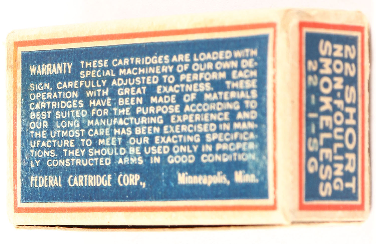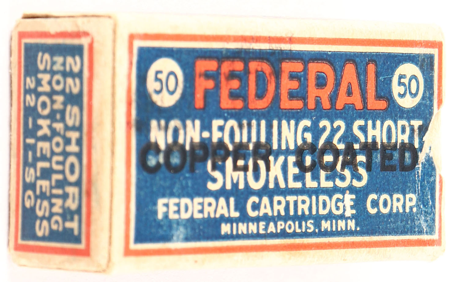 Federal, Non-Fouling Copper Coated, .22 Short, Smokeless, RHWeb: FCC-3 S-1c, Full, 1pc. Blue red & white box with black over-stamp, box is solid with very good color, some age soiling & corner wear, very minor edge wear, end flaps are solid, ammo is very good. Grade: Excellent - Value: 100 to 300