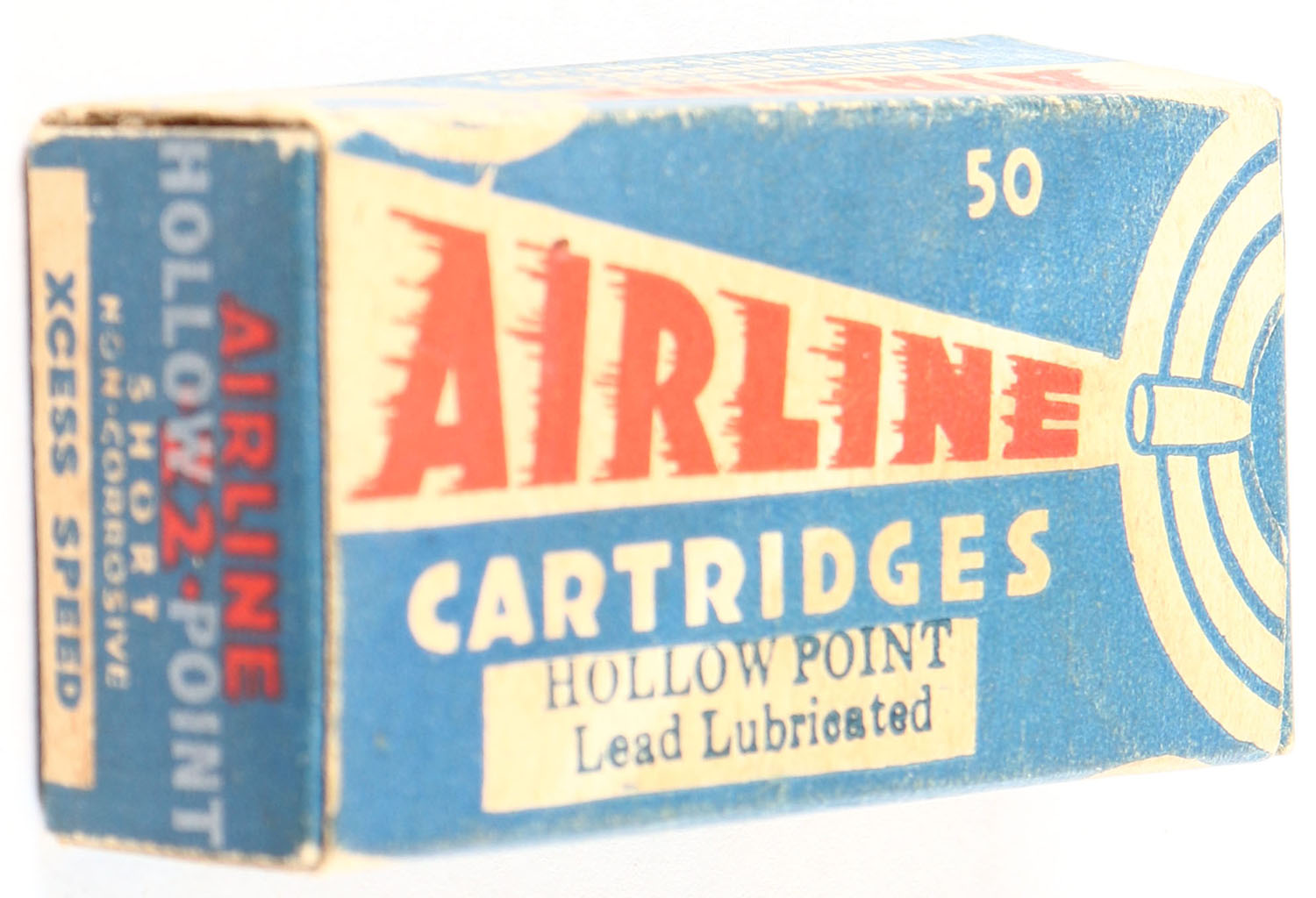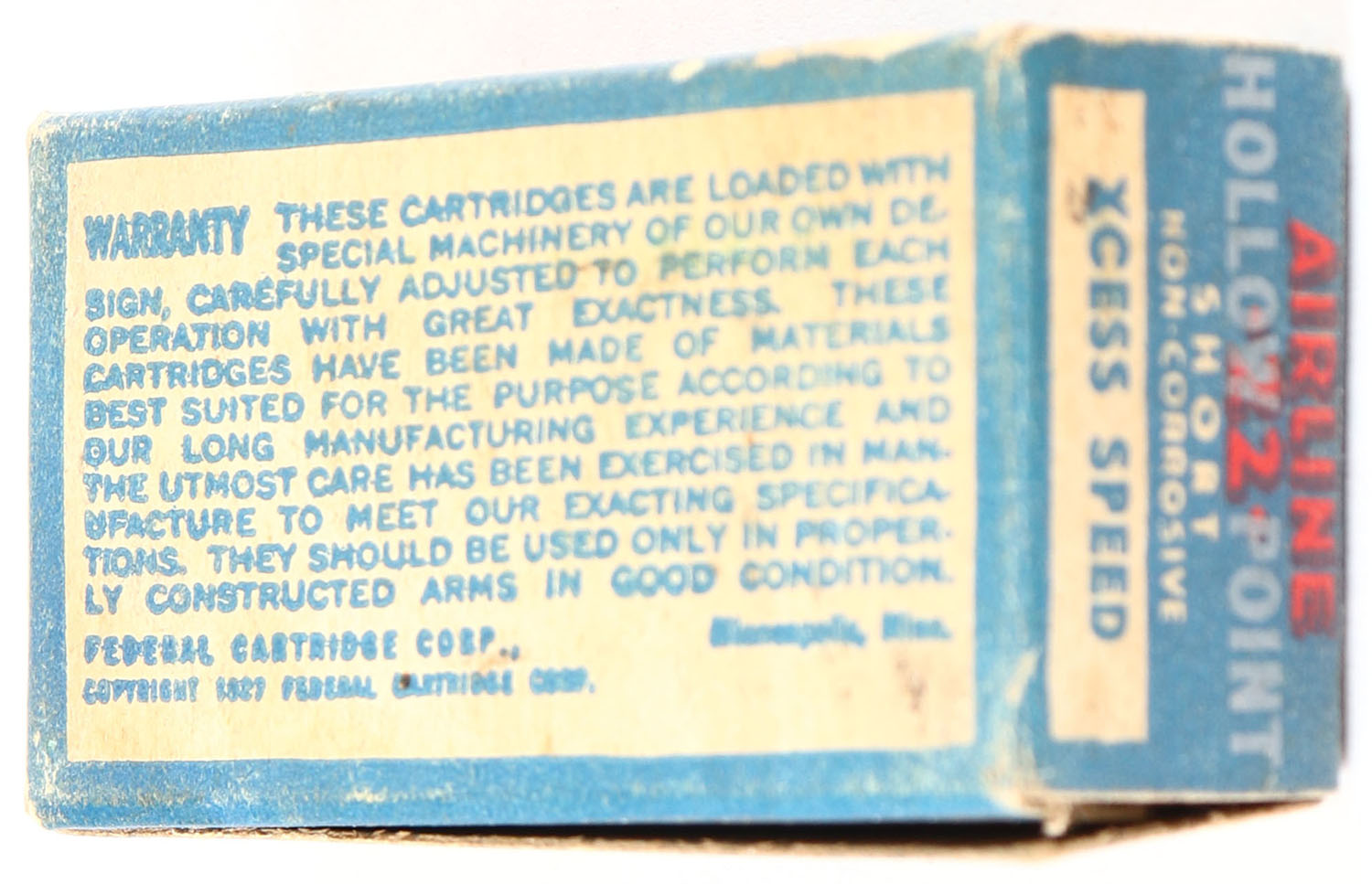 Federal, Airline, .22 Short Hollow Point, Lead Lubricated, Not in RHWeb, Similar to FCC-4.3 S-10 only different ''Hollow Point'' font on top & ''Hollow Point'' over-stamp on ends, Partial 48rds., 1pc. Blue white & red box, box is solid with very good color, some age soiling, very minor corner wear, edges are crisp, end flaps are solid, ammo is excellent. Grade: Very Good ++ - Value: 100 to 300