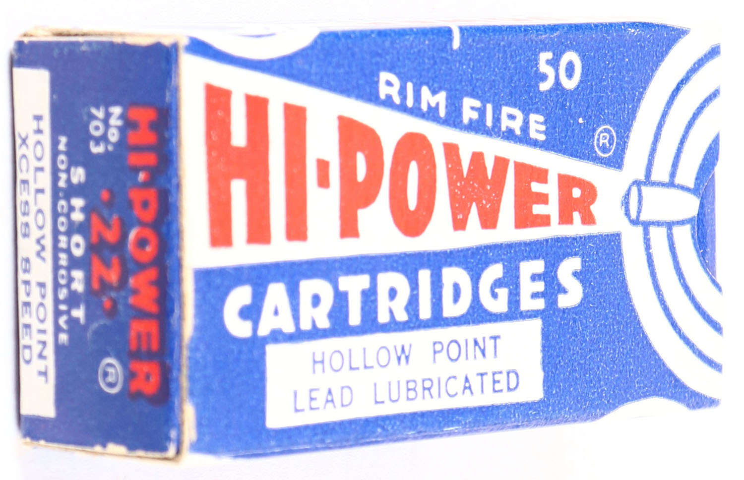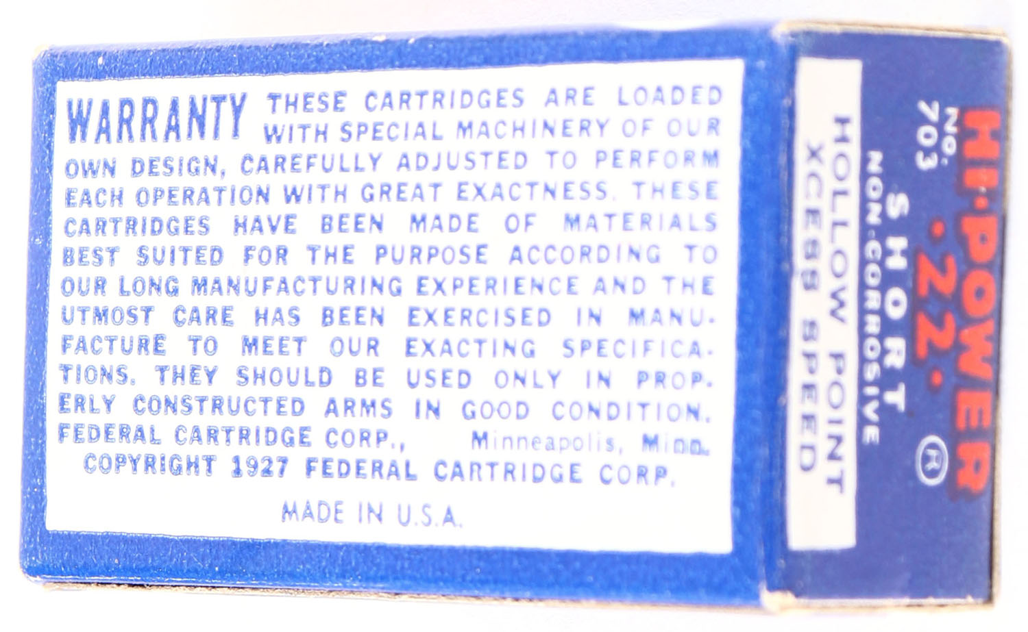 Federal, Hi-Power, .22 Short Hollow Point, Lead Lubricated, RHWeb: FED-5 S-3a, Full, 1pc. Blue white & red box, box is MINT with minty color, corners are sharp, edges are crisp, end flaps are solid, ammo is excellent to minty. Grade: MINT - Value: 20 to 60
