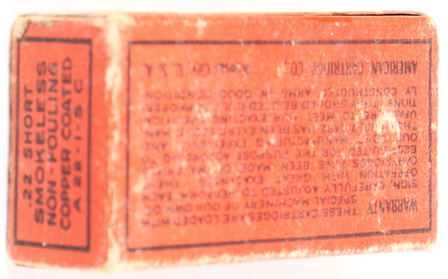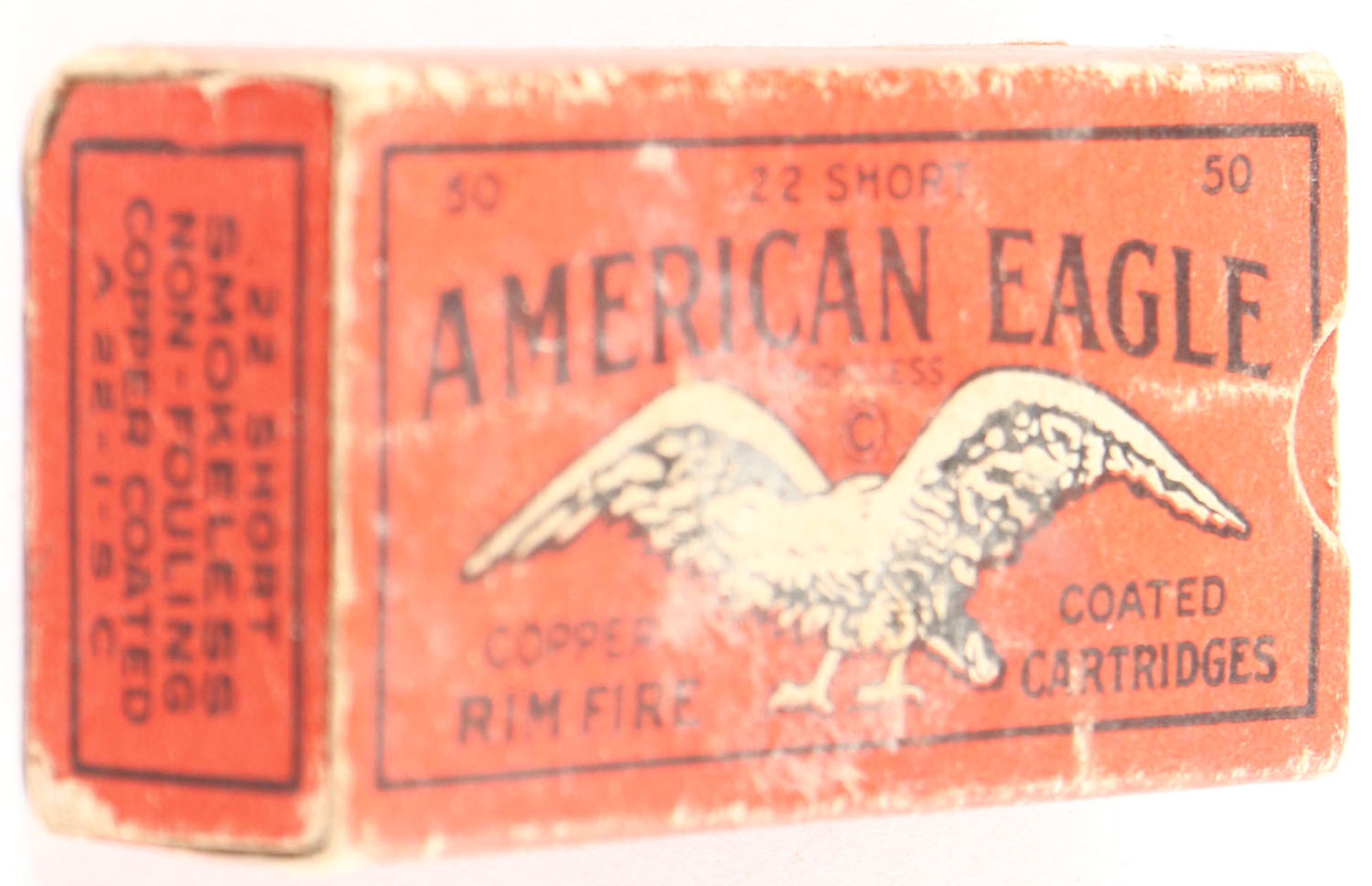 American, American Eagle, .22 Short, Copper Coated, Non Fouling, RHWeb: ACC-1 S-2b, Partial 45rds., 1pc. Red box, box is solid with very good color, some shelf & corner wear, minor age soiling, minor edge wear, end flaps are solid, ammo is very good. Grade: Very Good + - Value: 10 to 50