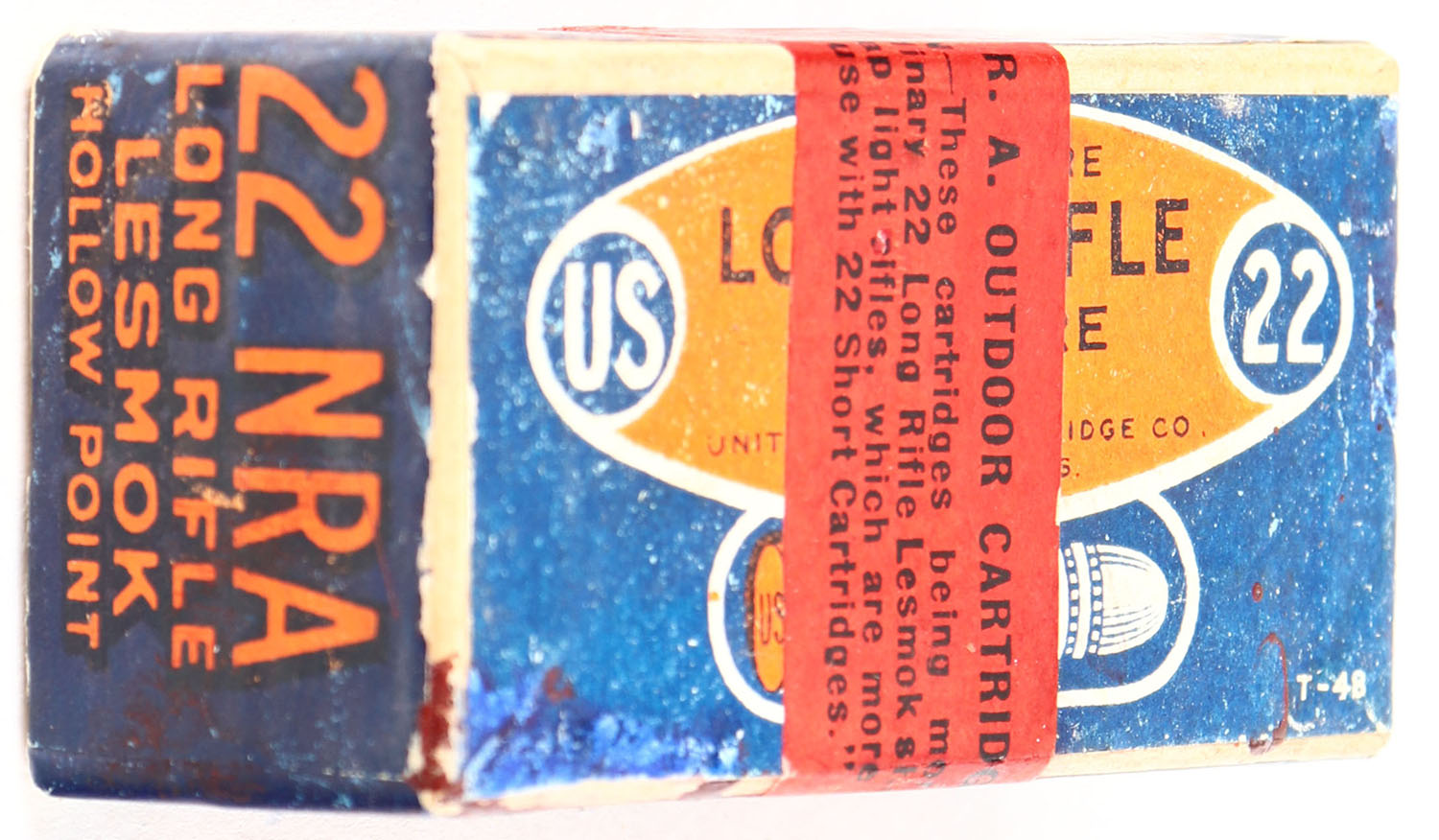 U.S., 22 NRA, .22 Long Rifle Hollow Point, Lesmok, RHWeb: US-51 LR-4b, FULL & SEALED, 2pc. Buff box with blue/orange top & side sealing labels with red ''Outdoor Cartridges'' over-label, box is solid with very good to excellent color, some color repairs on edges, corners are mostly sharp, edges are crisp, over-label is 95% intact. Grade: Excellent + - Value: 20 to 60