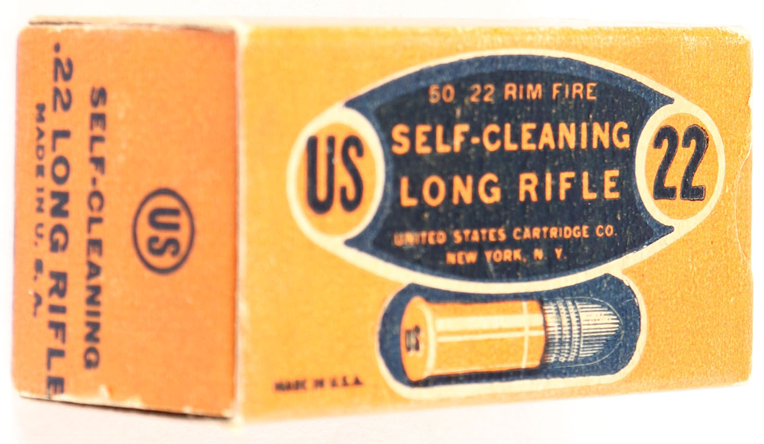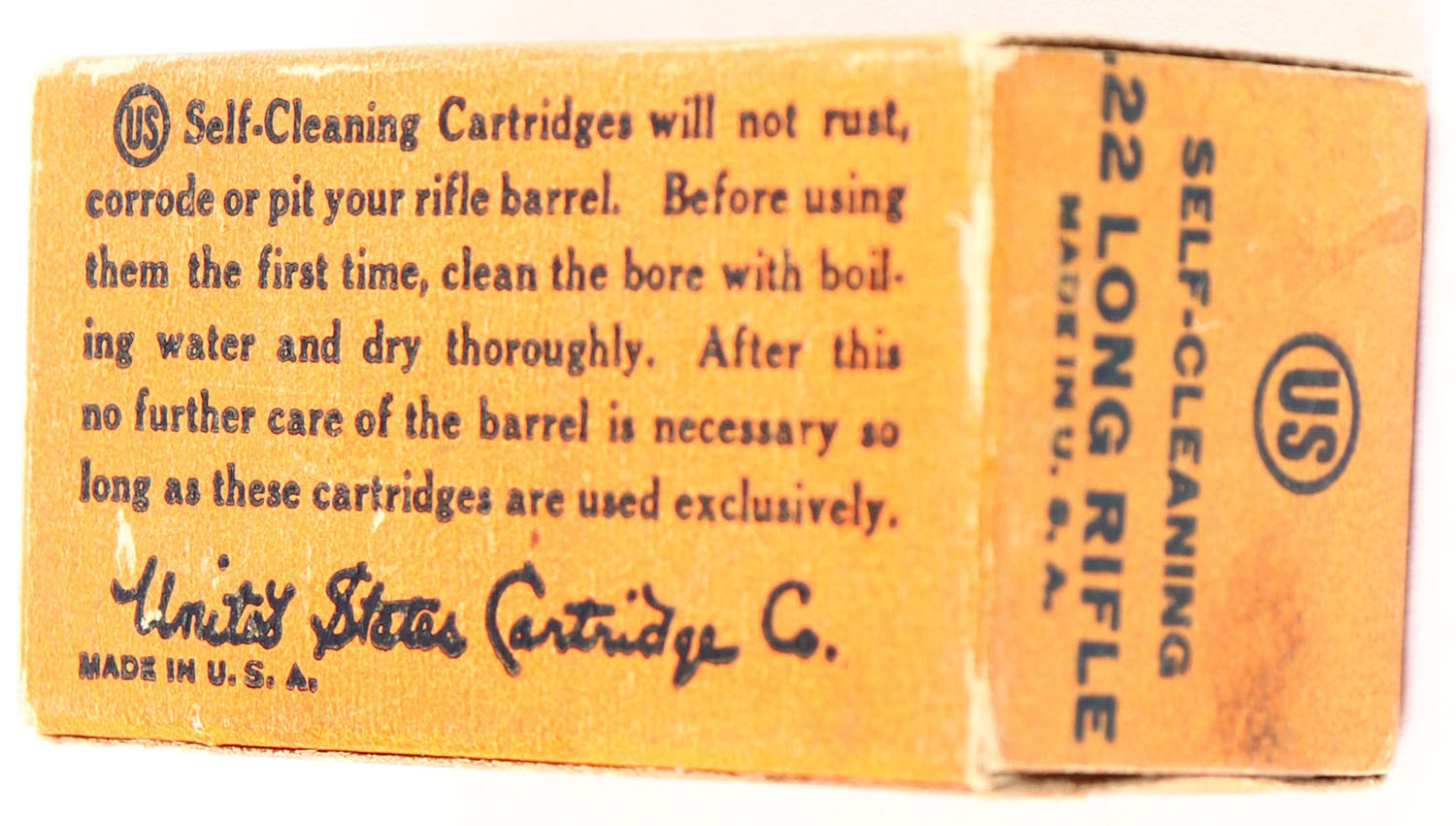 U.S., Self-Cleaning, .22 Long Rifle, RHWeb: US-10A LR-1.1b, Full, 1pc. Orange & black box, box is solid with very good color, minor color fading, very minor corner wear, edges are crisp, end flaps are solid, ammo is excellent. Grade: Excellent - Value: 10 to 40