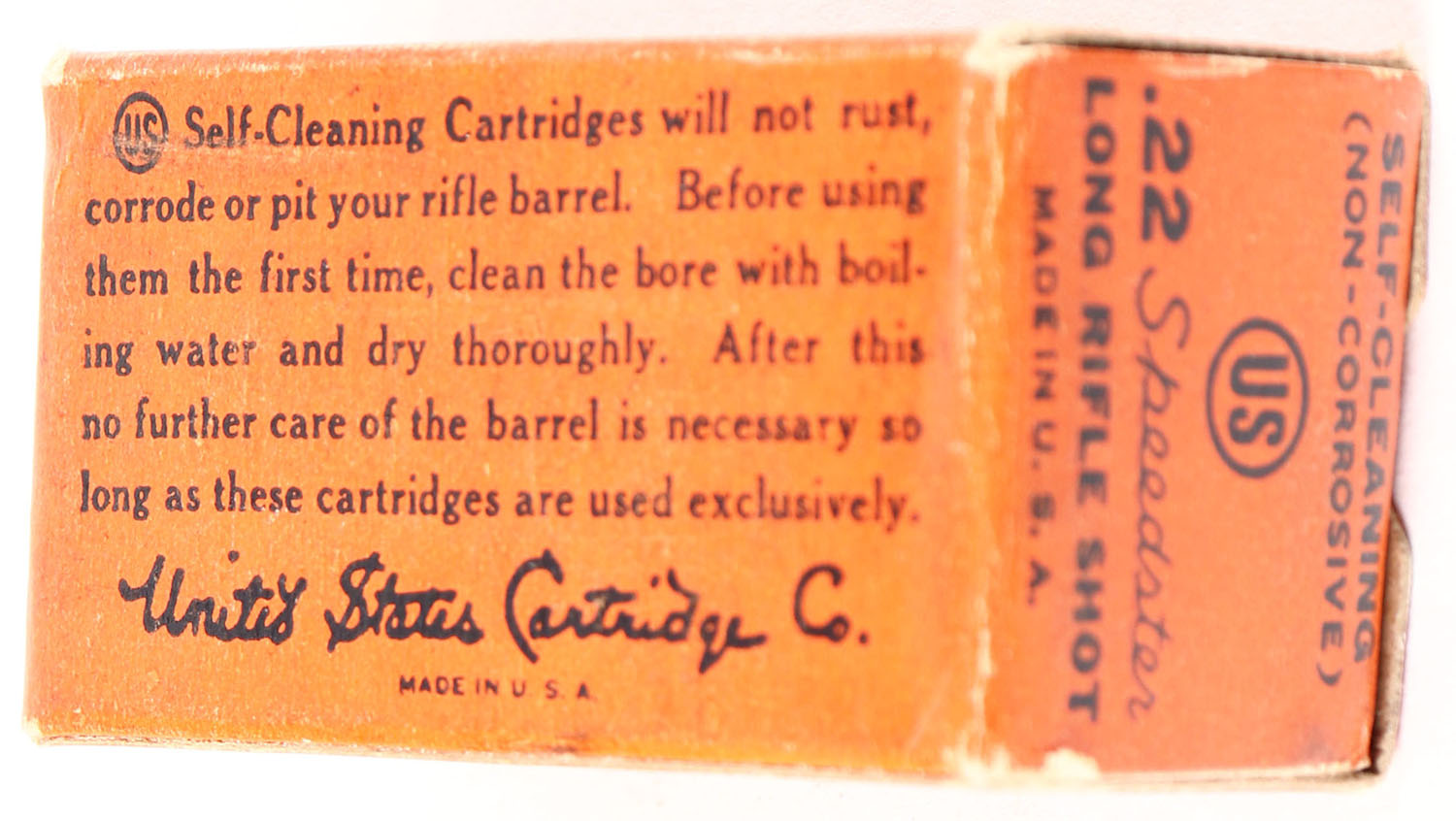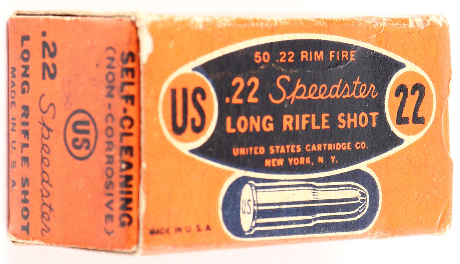 U.S., 22 Speedster, .22 Long Rifle Shot, RHWeb: US-13 LR-5, Full, 1pc. Orange & black box, box is solid with very good color, some age soiling, minor corner wear, some edge wear, end flaps are solid, ammo is excellent. Grade: Very Good ++ - Value: 50 to 250
