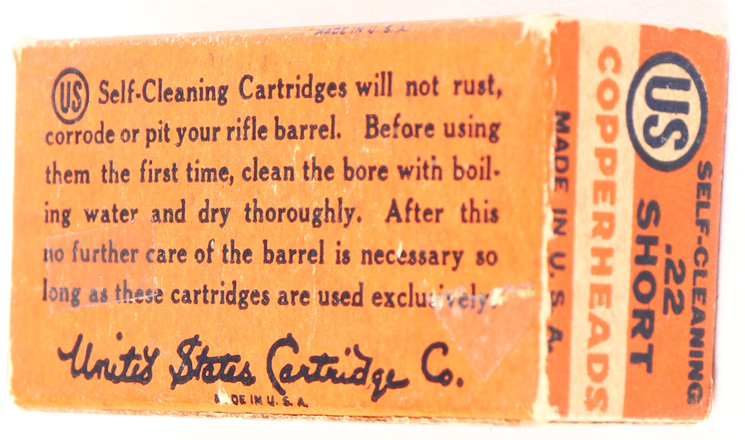 U.S., Self-Cleaning Copperheads, .22 Short, RHWeb: US-12 S-1a, Full, 1pc. Orange black & white box, box is solid with very good color, age soiling, some corner wear, edges are crisp, end flaps are solid, ammo is excellent. Grade: Very Good ++ - Value: 30 to 90
