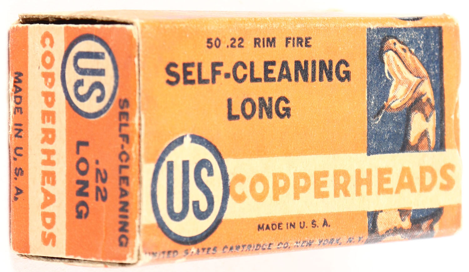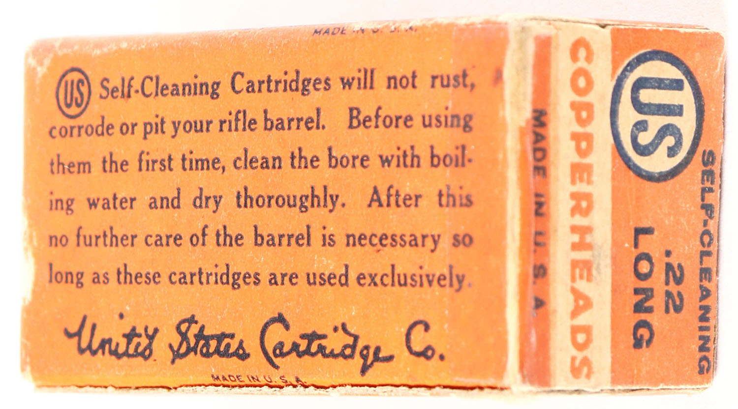 U.S., Self-Cleaning Copperheads, .22 Long, RHWeb: US-12 L-1b, Full, 1pc. Orange black & white box, box is solid with very good color, some age soiling & corner wear, edges are crisp, end flaps are solid, ammo is excellent. Grade: Very Good ++ - Value: 30 to 90