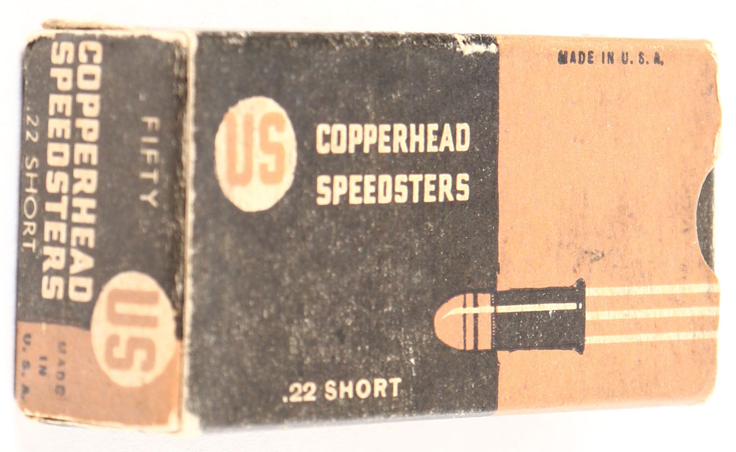 U.S., Copperhead Speedsters, .22 Short, RHWeb: US-13 S-1e, Full, 1pc. Black & bronze box, box is solid with very good color, some age soiling & color fading, minor corner wear, edges are mostly crisp, end flaps are solid, ammo is excellent. Grade: Very Good + - Value: 10 to 50
