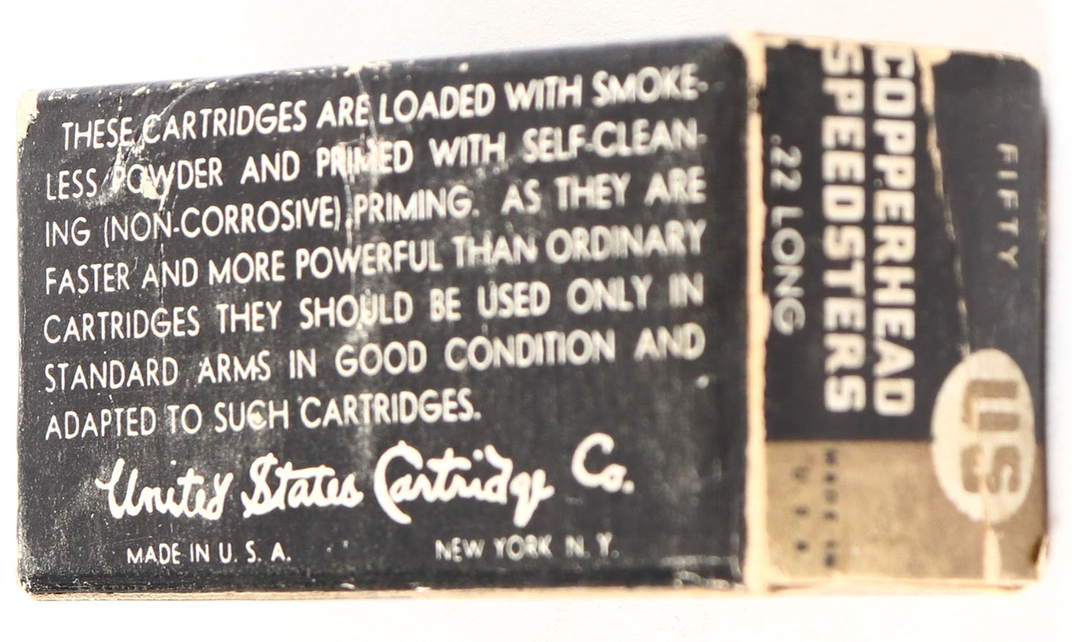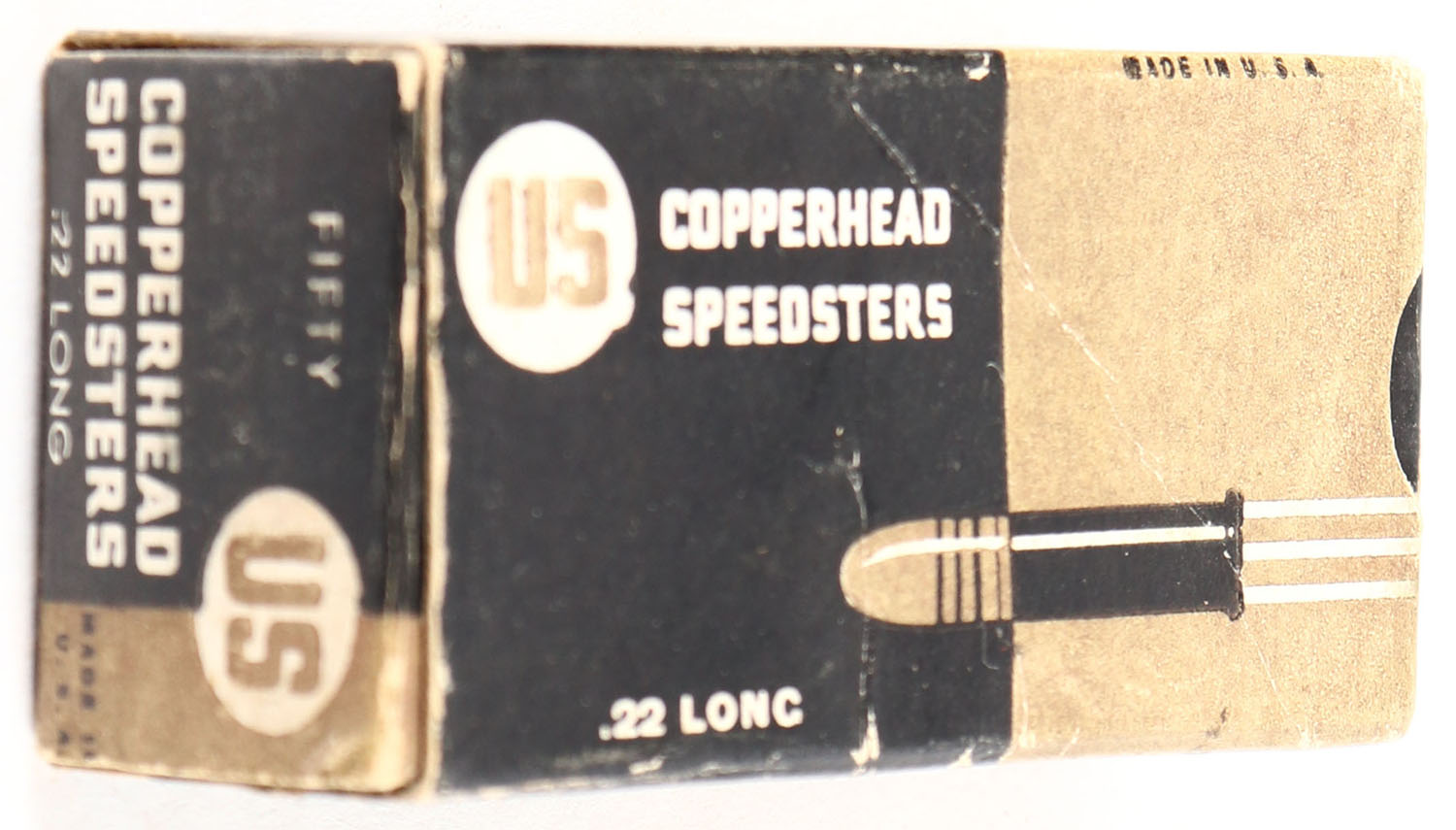 U.S., Copperhead Speedsters, .22 Long, RHWeb: US-13 L-1b, Full, 1pc. Black & bronze box, box is solid with very good color, color fading, some edge & corner wear, end flaps are solid, ammo is excellent. Grade: Very Good + - Value: 10 to 50