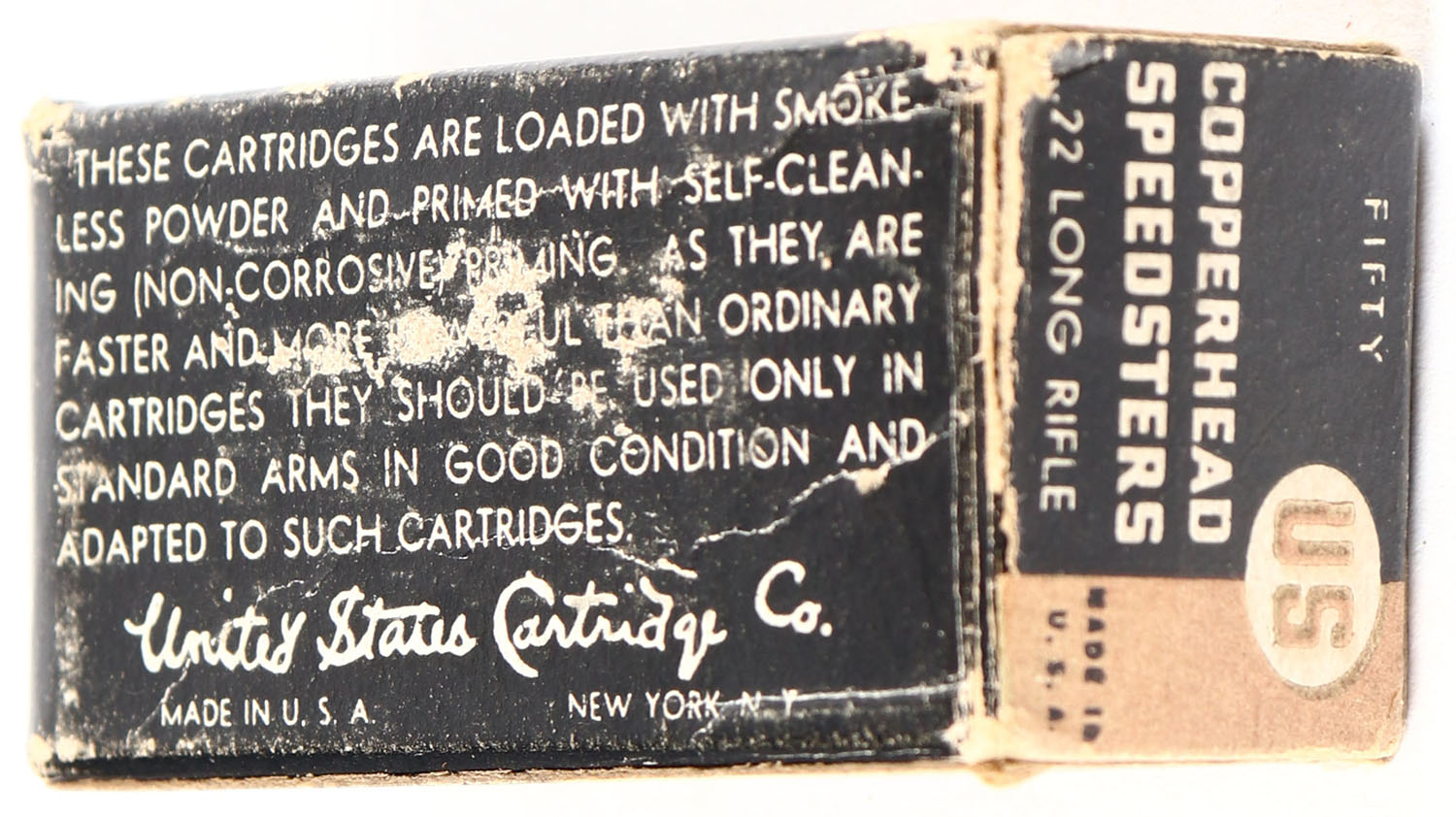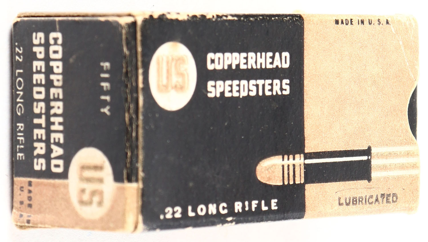 U.S., Copperhead Speedsters, .22 Long Rifle, Lubricated, RHWeb: US-13 LR-2a, Full, 1pc. Black & bronze box, box is solid with very good to excellent color, some color fading, minor corner wear, very minor edge wear, right end flap is partially torn, left end flap is solid, ammo is excellent. Grade: Very Good ++ - Value: 30 to 90