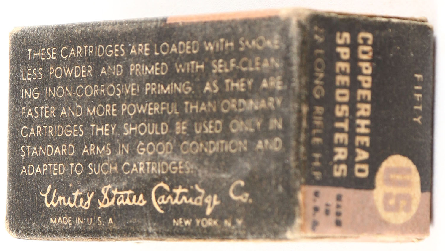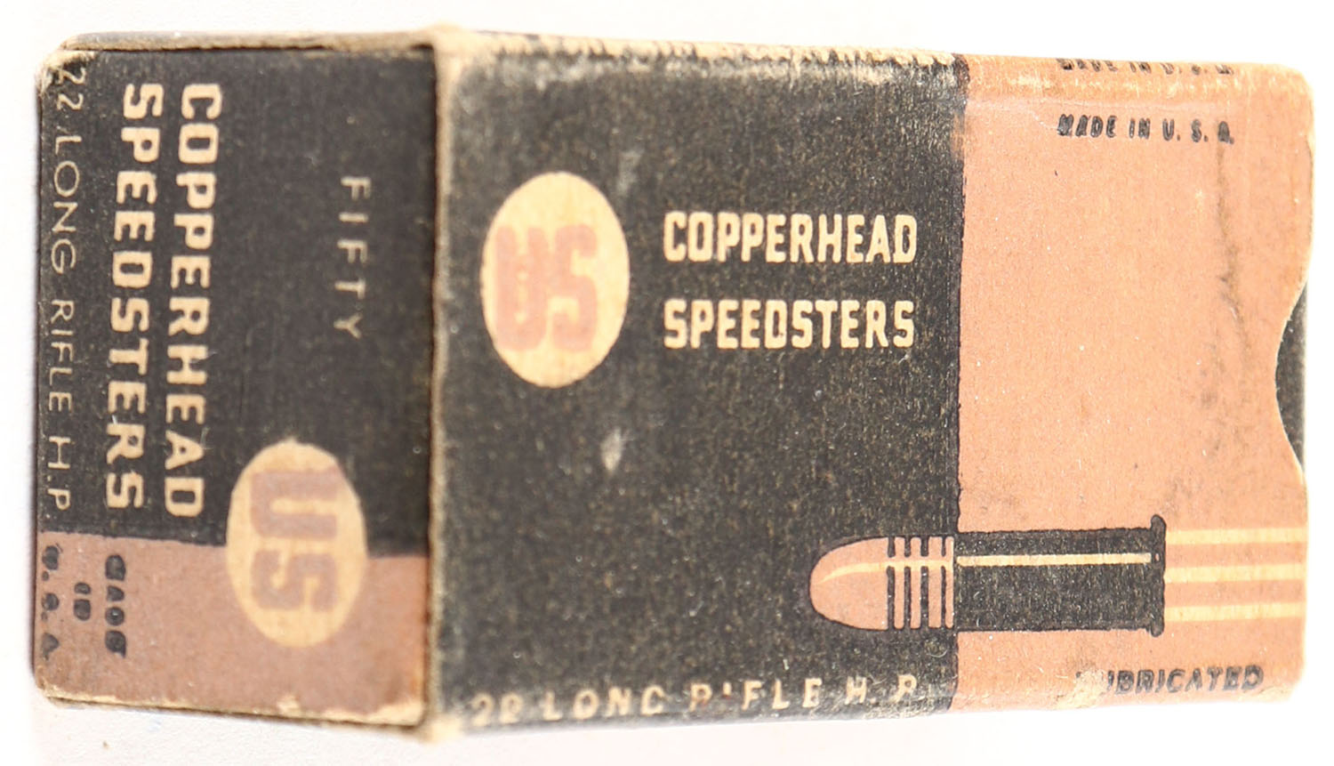 U.S., Copperhead Speedsters, .22 Long Rifle Hollow Point, Lubricated, RHWeb: US-13 LR-4e, Full, 1pc. Black & bronze box, box is solid with very good color, some age soiling & color fading, minor edge & corner wear, end flaps are solid, ammo is excellent. Grade: Very Good ++ - Value: 8 to 40