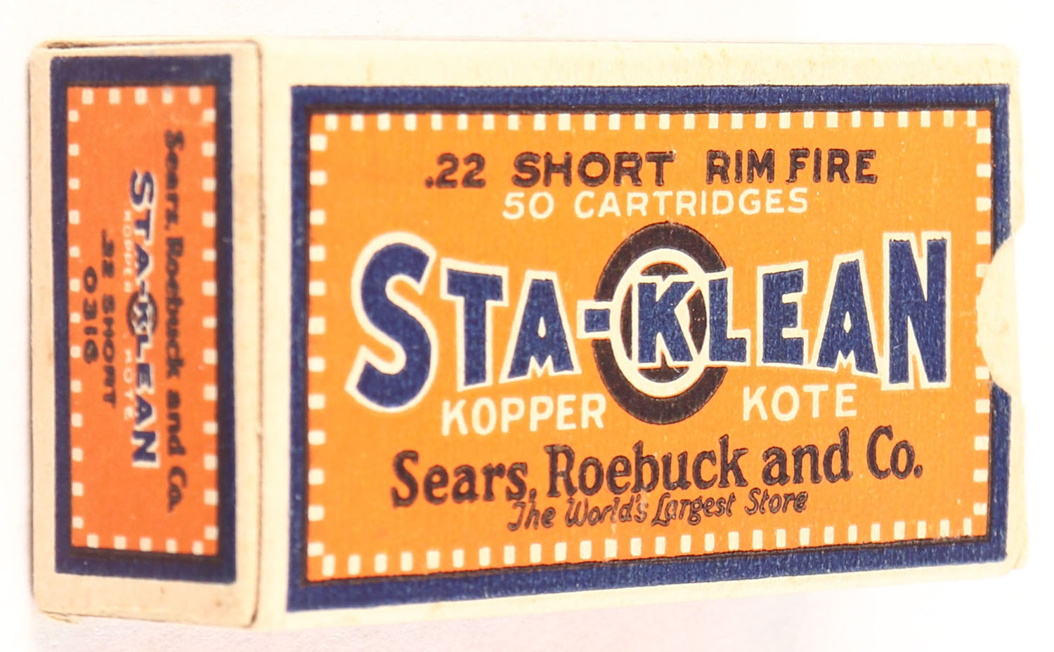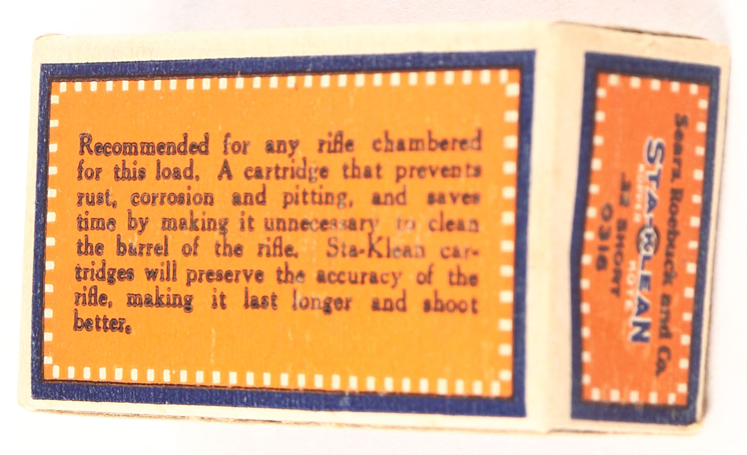 Sears, Sta-Clean, .22 Short, Kopper Kote, RHWeb: SEARS-3 S-1.5 Scarce 0316 product code, Full, 1pc. Orange blue & buff box, box is near mint with minty color, only very minor corner wear, edges are crisp, end flaps are solid, ammo is excellent. Grade: Excellent ++ - Value: 40 to 120